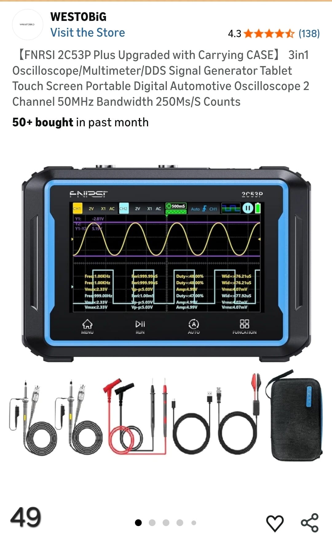 【FNRSI 2C53P Plus Upgraded with Carrying CASE】 3in1 Oscilloscope/Multimeter/DDS Signal Generator Tablet Touch Screen Portable Digital Automotive Oscilloscope 2 Channel 50MHz Bandwidth 250Ms/S Counts. Lv49