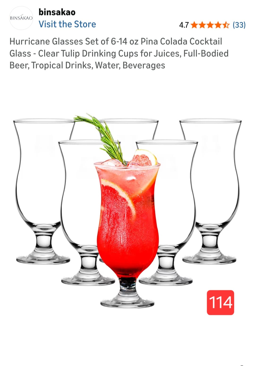 Hurricane Glasses Set of 6-14 oz Pina Colada Cocktail Glass - Clear Tulip Drinking Cups for Juices, Full-Bodied Beer, Tropical Drinks, Water, Beverages. 114