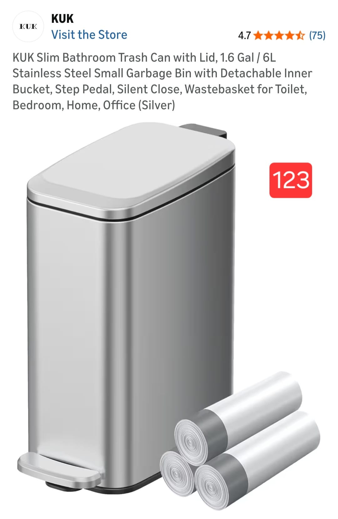 KUK Slim Bathroom Trash Can with Lid, 1.6 Gal / 6L Stainless Steel Small Garbage Bin with Detachable Inner Bucket, Step Pedal, Silent Close, Wastebasket for Toilet, Bedroom, Home, Office. 123