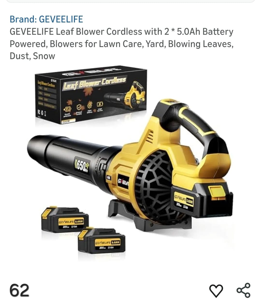 GEVEELIFE Leaf Blower Cordless with 2* 5.0Ah Battery Powered, Blowers for Lawn Care, Yard, Blowing Leaves, Dust, Snow. Lv62