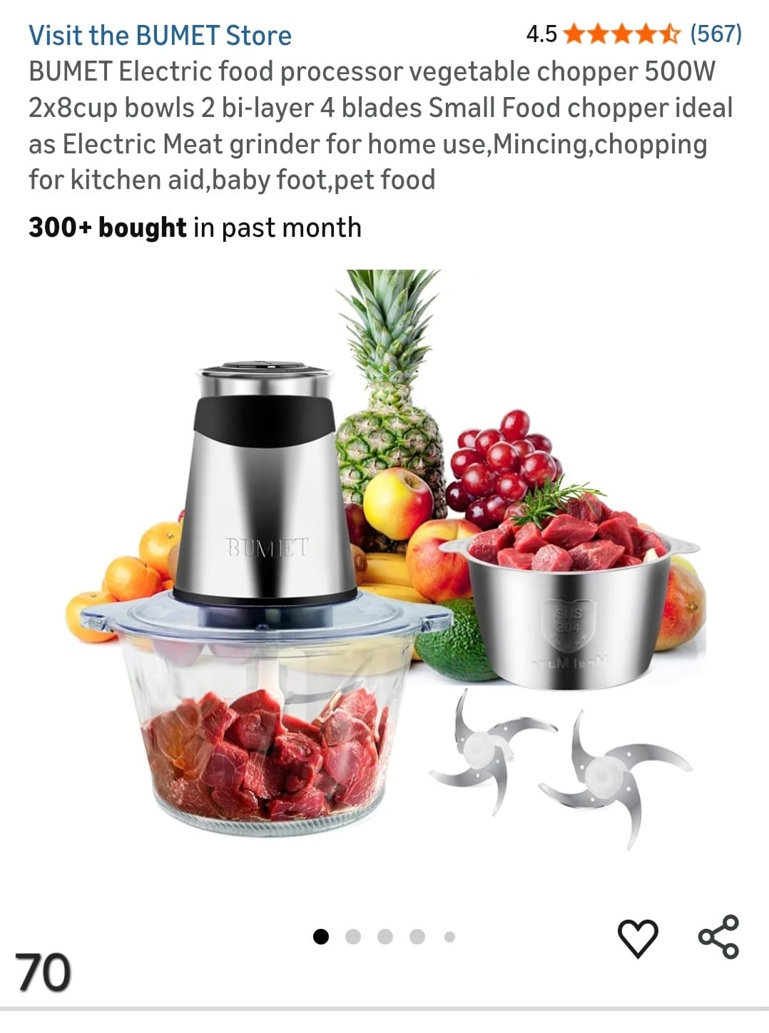 BUMET Electric food processor vegetable chopper 500W 2x8cup bowls 2 bi-layer 4 blades Small Food chopper ideal as Electric Meat grinder for home use, Mincing, chopping for kitchen aid, baby foot, pet food. Lv70