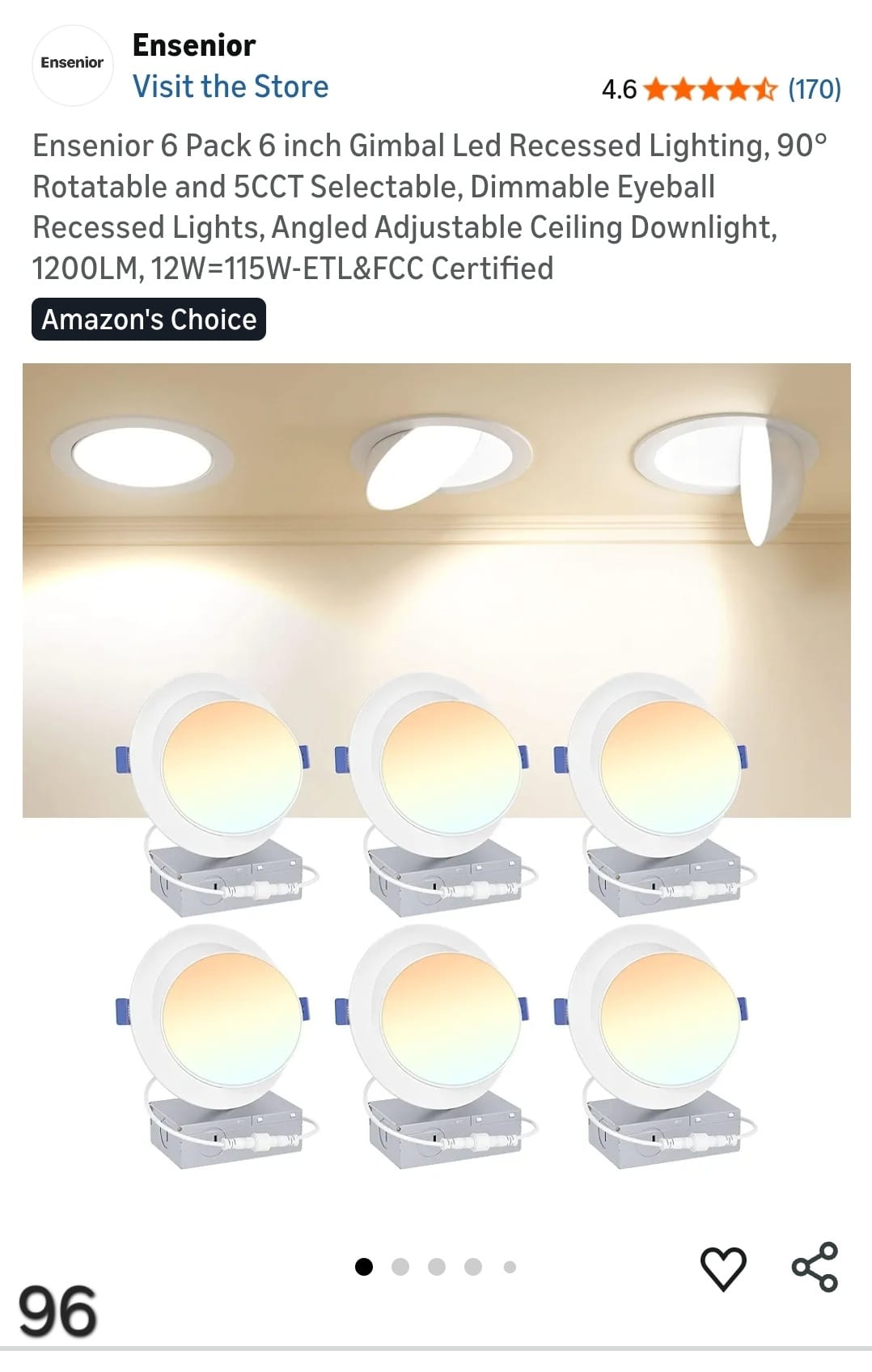 Ensenior 6 Pack 6 inch Gimbal Led Recessed Lighting, 90° Rotatable and 5CCT Selectable, Dimmable Eyeball Recessed Lights, Angled Adjustable Ceiling Downlight, 1200LM, 12W=115W-ETL&FCC Certified. Lv96