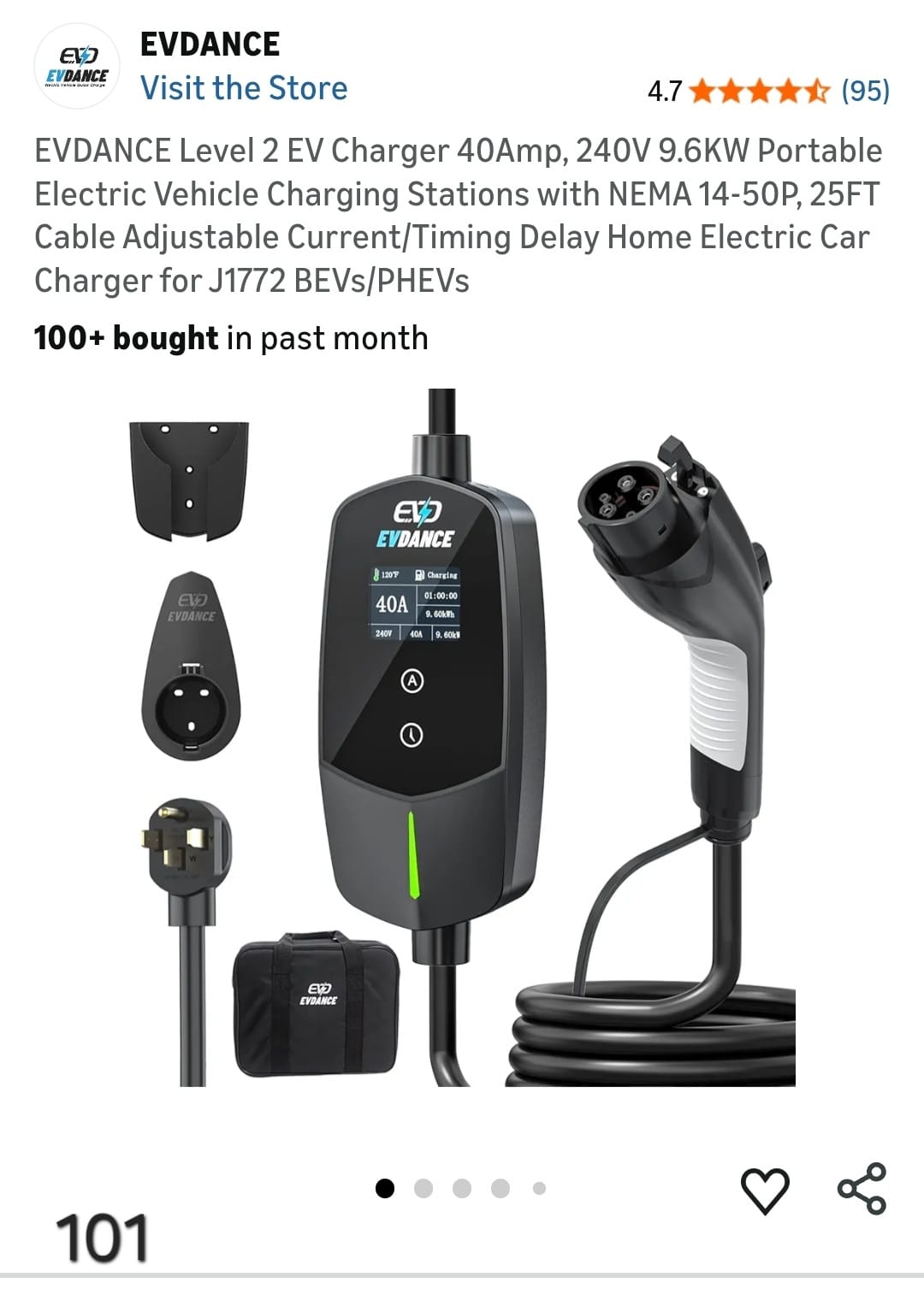 EVDANCE Level 2 EV Charger 40Amp, 240V 9.6KW Portable Electric Vehicle Charging Stations with NEMA 14-50P, 25FT Cable Adjustable Current/Timing Delay Home Electric Car Charger for J1772 BEVs/PHEVS. Lv101