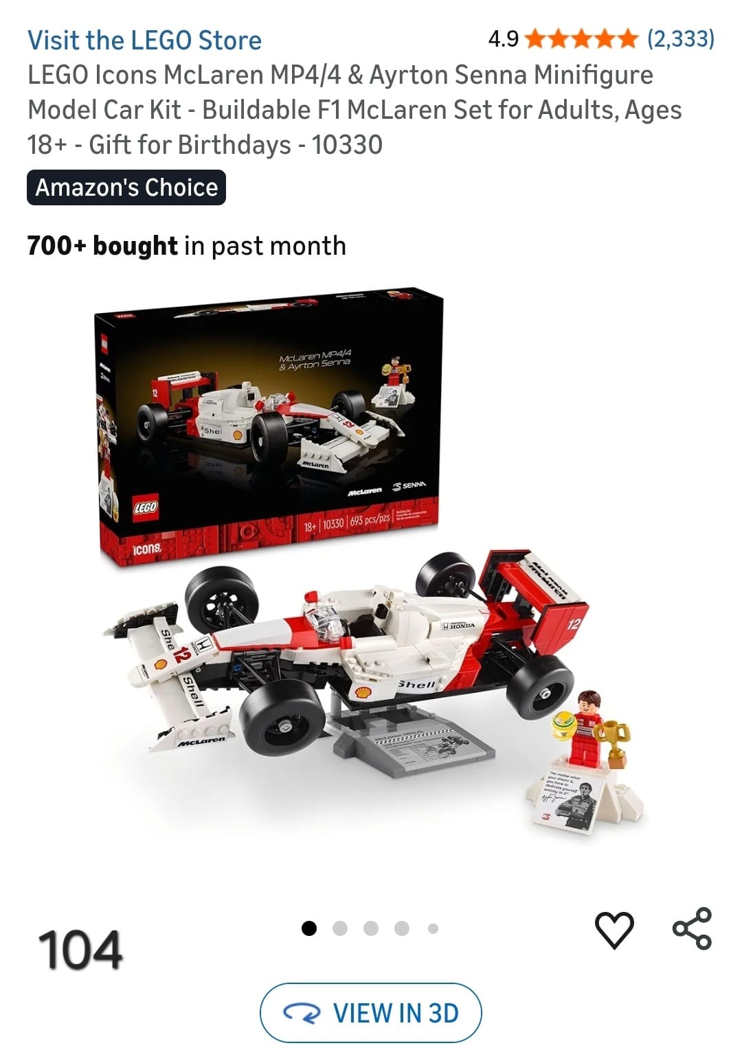 LEGO Icons McLaren MP4/4 & Ayrton Senna Minifigure Model Car Kit - Buildable F1 McLaren Set for Adults, Ages 18+ - Gift for Birthdays - 10330. Lv104