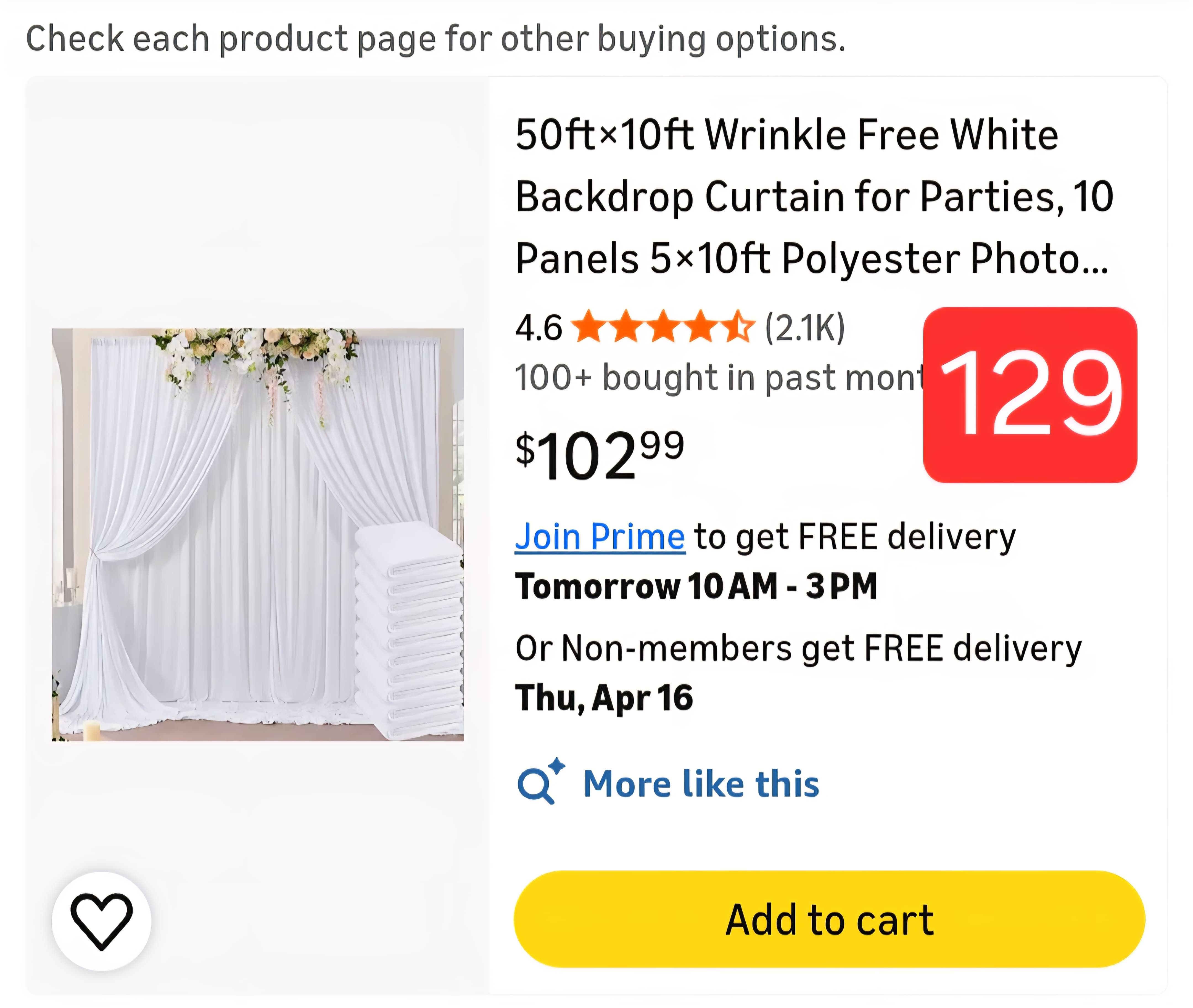 50ftx10ft Wrinkle Free White Backdrop Curtain for Parties, 10 Panels 5x10ft Polyester Photo. 129
