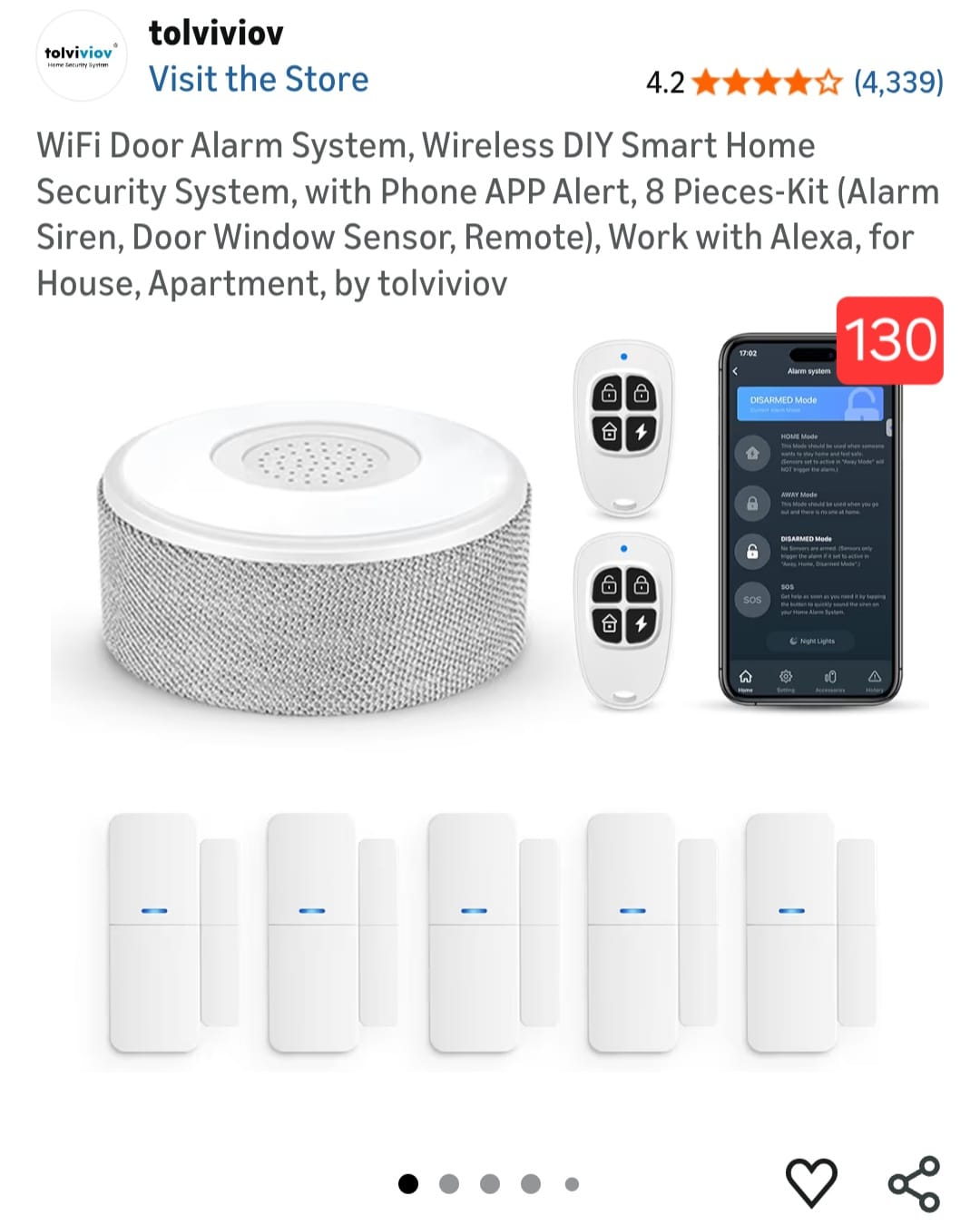 WiFi Door Alarm System, Wireless DIY Smart Home Security System, with Phone APP Alert, 8 Pieces-Kit (Alarm Siren, Door Window Sensor, Remote), Work with Alexa, for House, Apartment, by tolviviov. 130