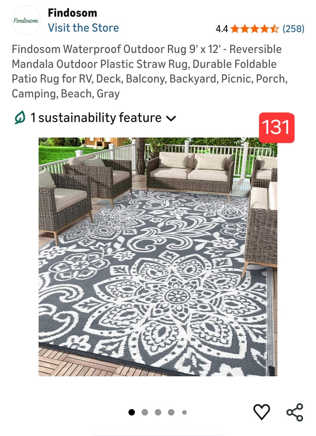 Findosom Waterproof Outdoor Rug 9' x 12' - Reversible Mandala Outdoor Plastic Straw Rug, Durable Foldable Patio Rug for RV, Deck, Balcony, Backyard, Picnic, Porch, Camping, Beach, Gray. 131