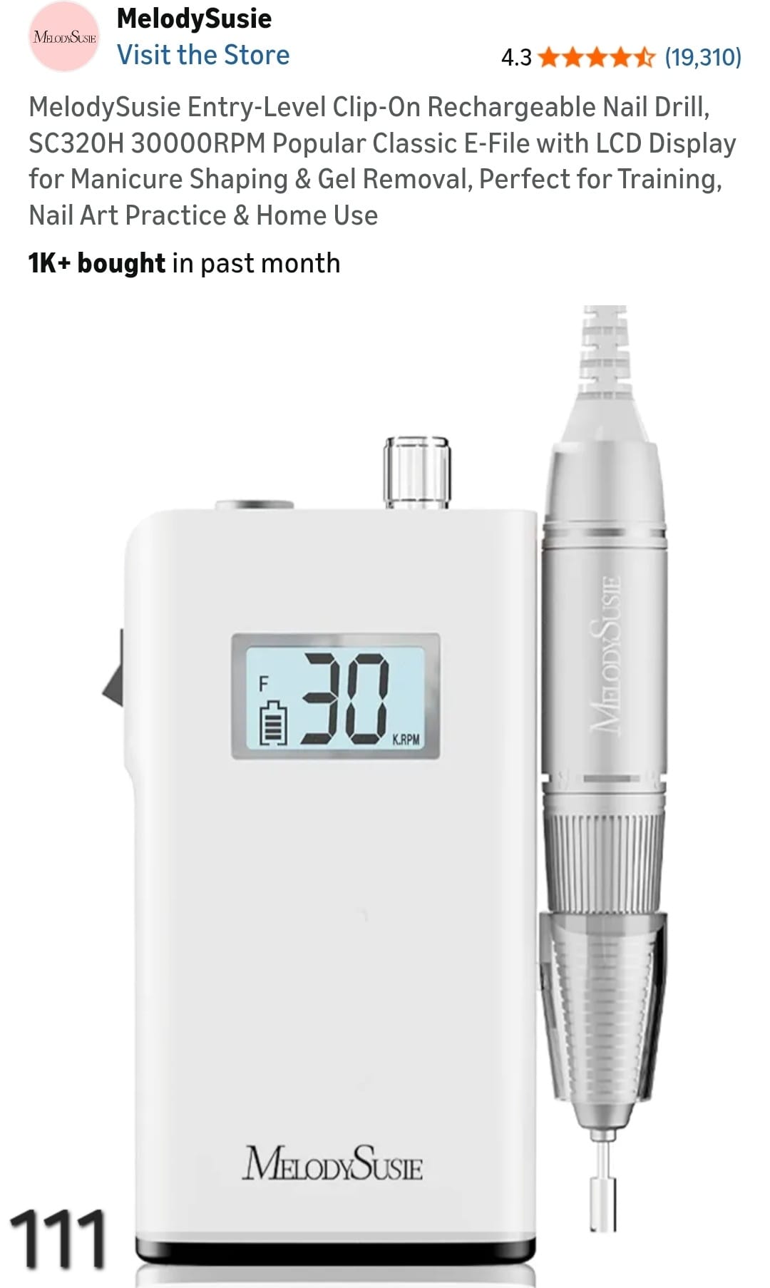 MelodySusie Entry-Level Clip-On Rechargeable Nail Drill, SC320H 30000RPM Popular Classic E-File with LCD Display for Manicure Shaping & Gel Removal, Perfect for Training, Nail Art Practice & Home Use. Lv111