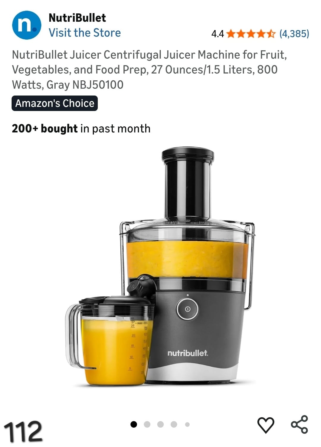 NutriBullet Juicer Centrifugal Juicer Machine for Fruit, Vegetables, and Food Prep, 27 Ounces/1.5 Liters, 800 Watts, Gray NBJ50100. Lv112