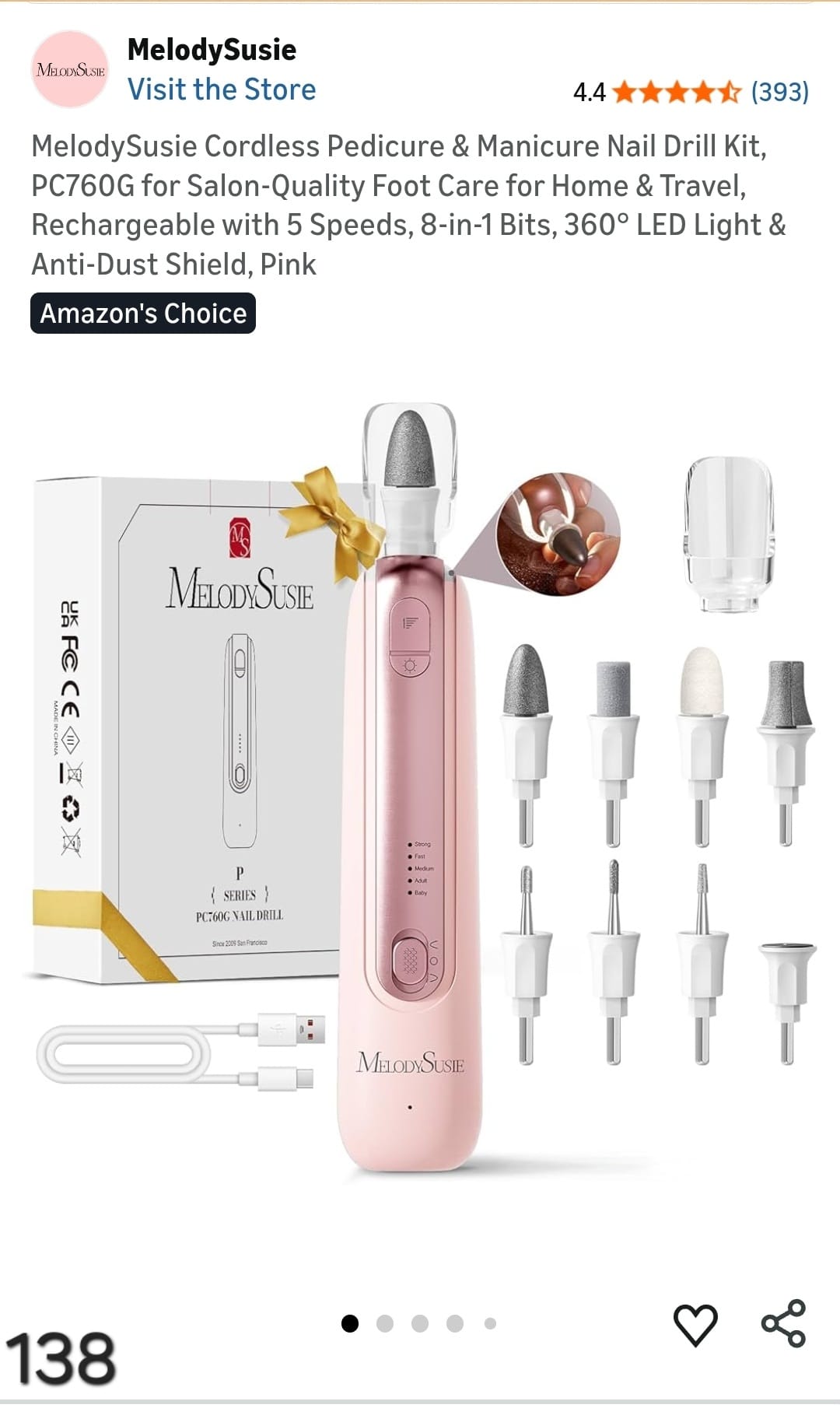 MelodySusie Cordless Pedicure & Manicure Nail Drill Kit, PC760G for Salon-Quality Foot Care for Home & Travel, Rechargeable with 5 Speeds, 8-in-1 Bits, 360° LED Light & Anti-Dust Shield, Pink. Lv138