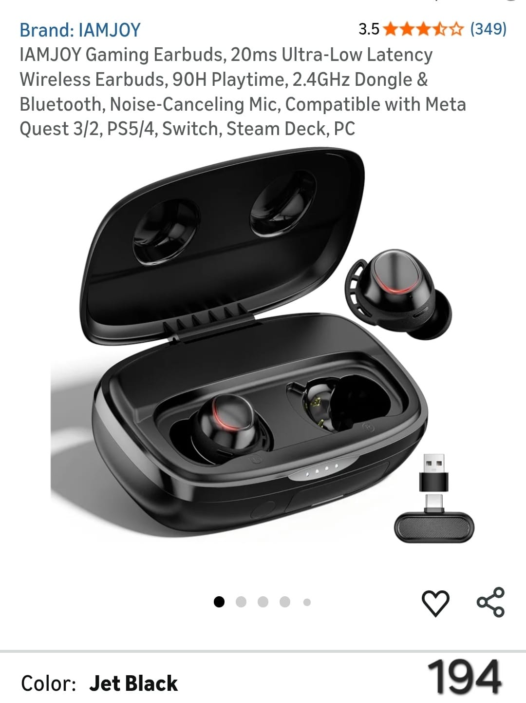 IAMJOY Gaming Earbuds, 20ms Ultra-Low Latency Wireless Earbuds, 90H Playtime, 2.4GHz Dongle & Bluetooth, Noise-Canceling Mic, Compatible with Meta Quest 3/2, PS5/4, Switch, Steam Deck, PC. Lv194