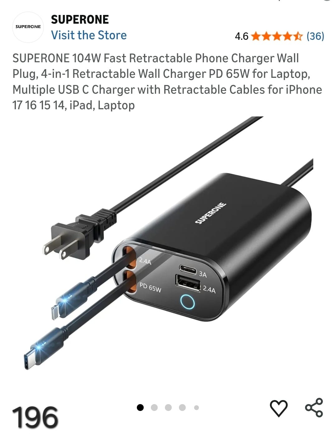 SUPERONE 104W Fast Retractable Phone Charger Wall Plug, 4-in-1 Retractable Wall Charger PD 65W for Laptop, Multiple USB C Charger with Retractable Cables for iPhone 17 16 15 14, iPad, Laptop. Lv196