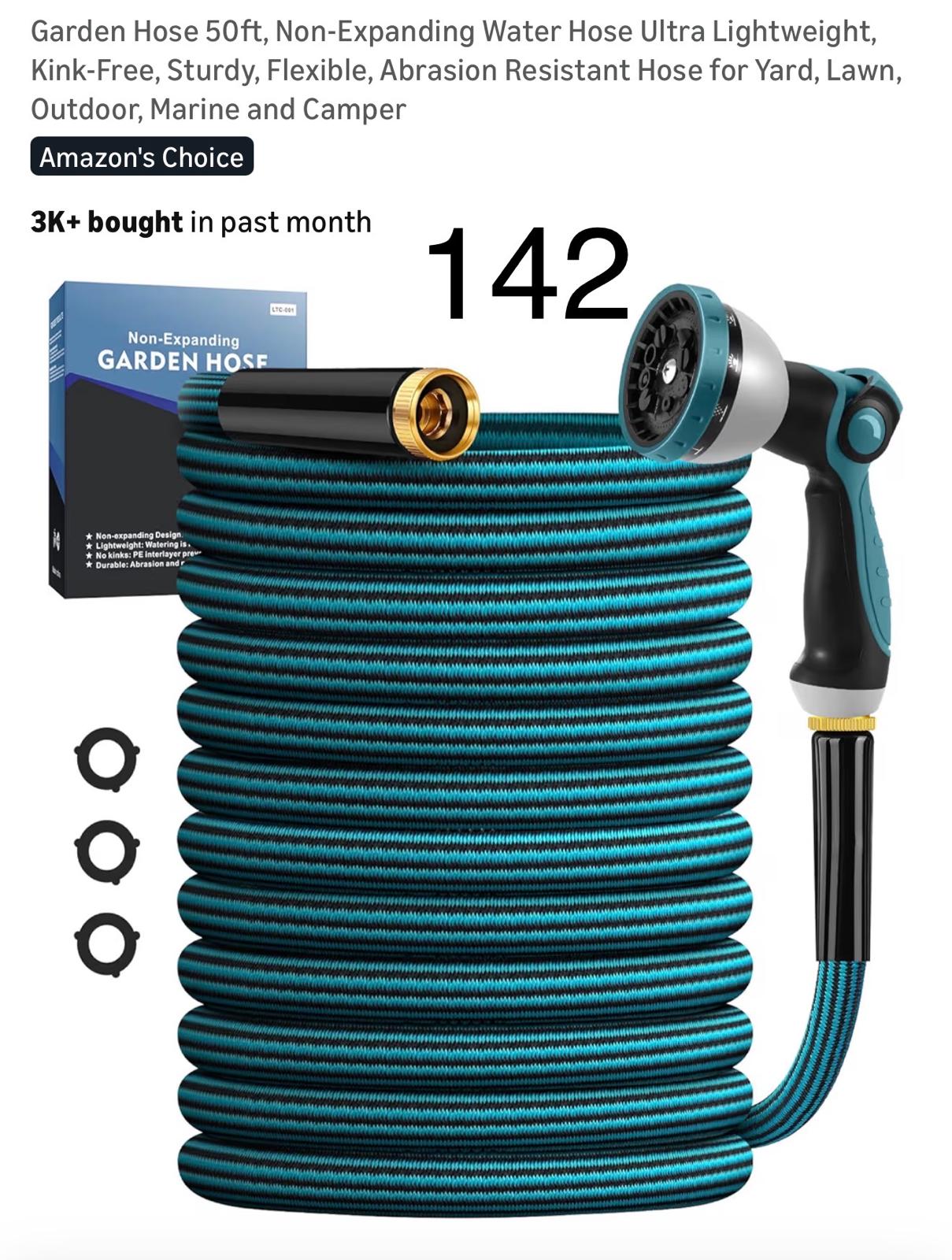 Garden Hose 50ft, Non-Expanding Water Hose Ultra Lightweight, Kink-Free, Sturdy, Flexible, Abrasion Resistant Hose for Yard, Lawn, Outdoor, Marine and Camper. 142