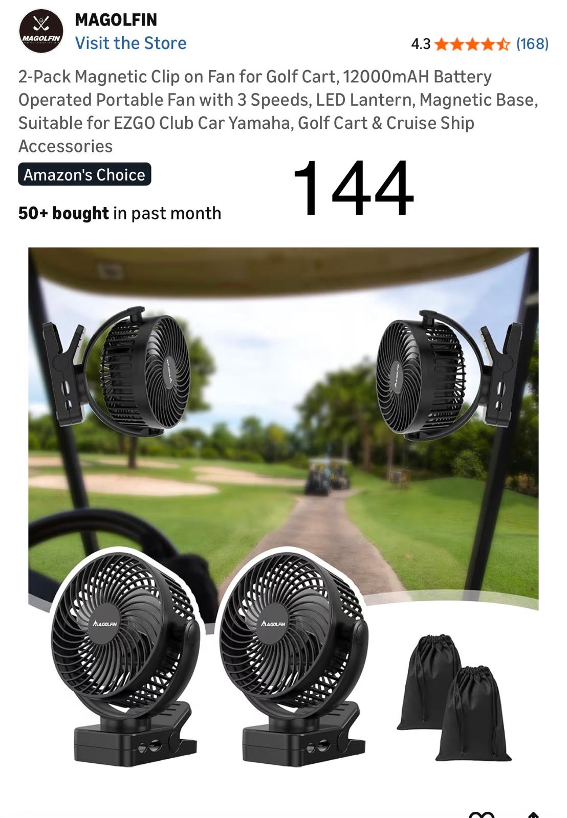 2-Pack Magnetic Clip on Fan for Golf Cart, 12000mAH Battery Operated Portable Fan with 3 Speeds, LED Lantern, Magnetic Base, Suitable for EZGO Club Car Yamaha, Golf Cart & Cruise Ship Accessories. 144