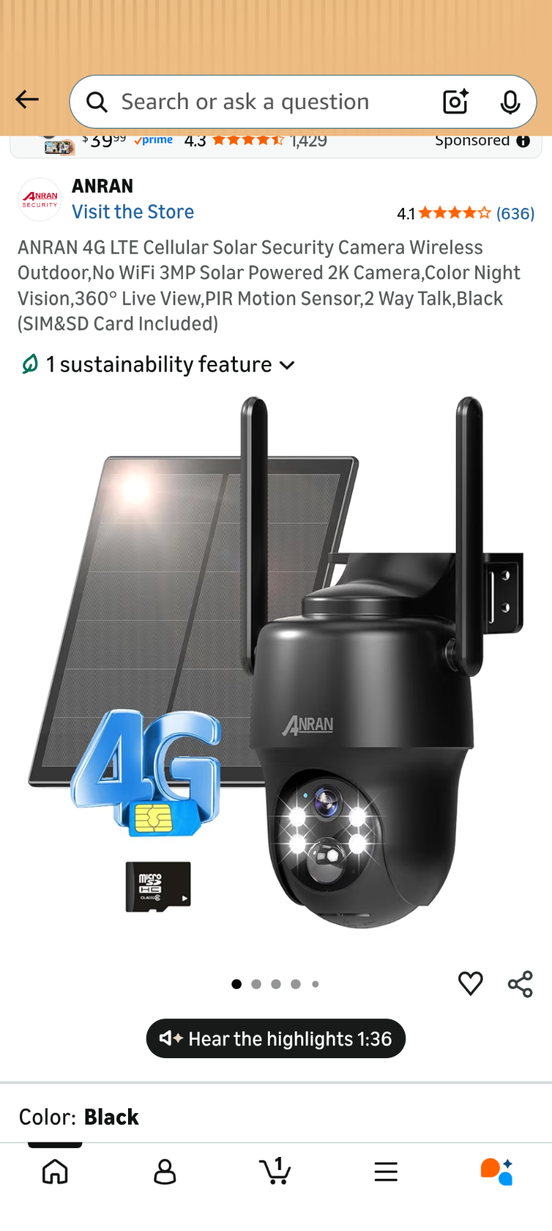 A59 ANRAN 4G LTE Cellular Solar Security Camera Wireless Outdoor,No WiFi 3MP Solar Powered 2K Camera,Color Night Vision,360° Live View,PIR Motion Sensor,2 Way Talk,Black