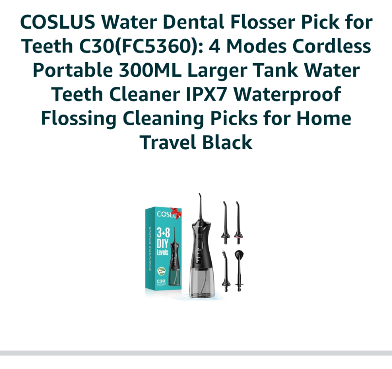 B45 COSLUS Water Dental Flosser Pick for Teeth C30(FC5360): 4 Modes Cordless Portable 300ML Larger Tank Water Teeth Cleaner IPX7 Waterproof Flossing Cleaning Picks for Home Travel Black