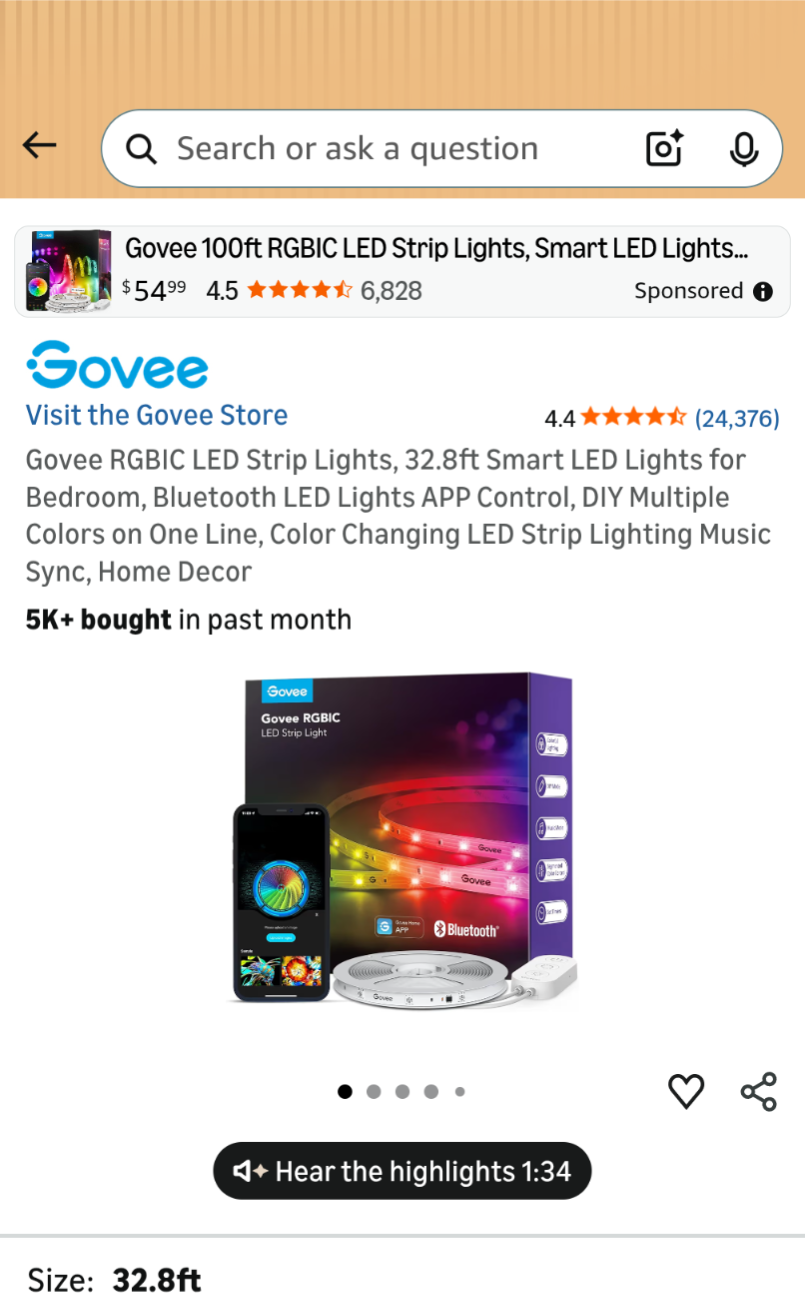 B53 Govee RGBIC LED Strip Lights, 32.8ft Smart LED Lights for Bedroom, Bluetooth LED Lights APP Control, DIY Multiple Colors on One Line, Color Changing LED Strip Lighting Music Sync, Home Decor
