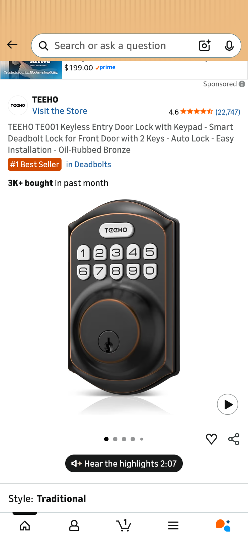 B56 TEEHO TE001 Keyless Entry Door Lock with Keypad - Smart Deadbolt Lock for Front Door with 2 Keys - Auto Lock - Easy Installatio
