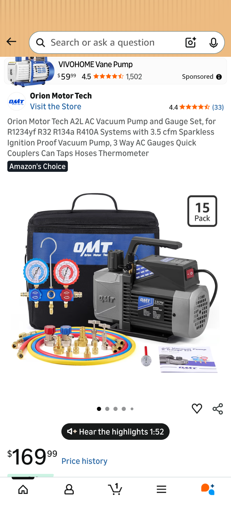 B65Orion Motor Tech A2L AC Vacuum Pump and Gauge Set, for R1234yf R32 R134a R410A Systems with 3.5 cfm Sparkless Ignition Proof Vacuum Pump, 3 Way AC Gauges Quick Couplers Can Taps Hoses Thermometer
