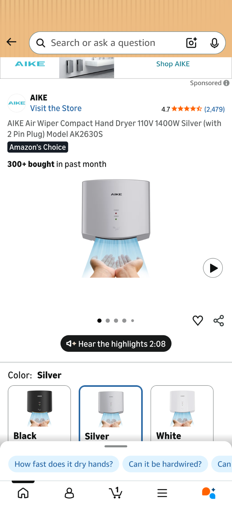 C40 AIKE Air Wiper Compact Hand Dryer 110V 1400W Silver (with 2 Pin Plug) Model AK2630S
