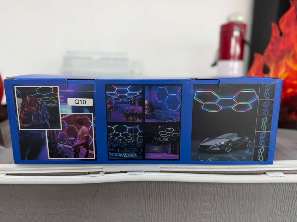 RGB Hexagon Garage Lights featuring a 24-pack of modular LED panels designed for customizable lighting in spaces like garages or game rooms. (Q10)