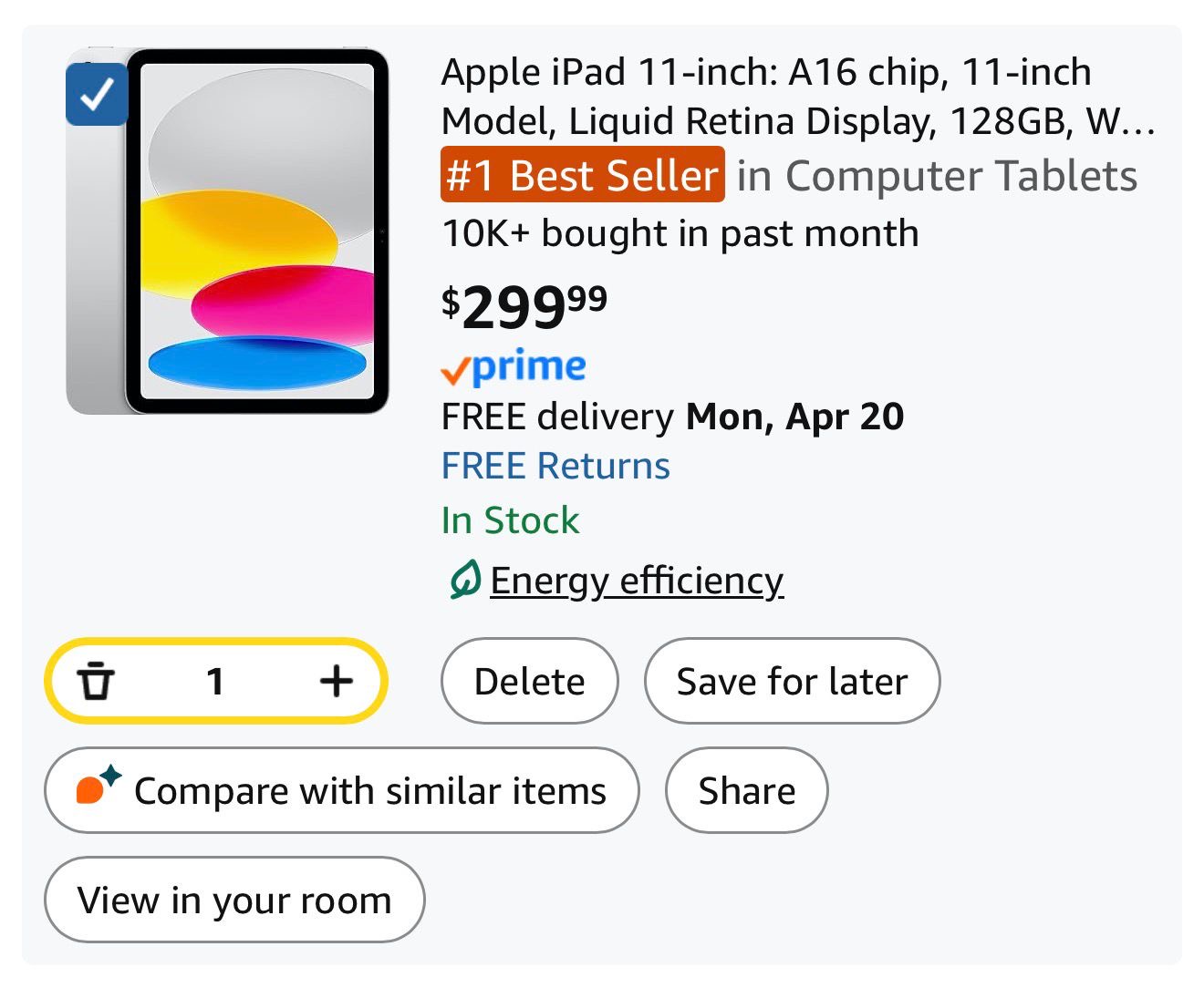 Apple iPad featuring a 10.86-inch liquid retina display, A16 chip, 128GB of storage, and 12MP front/back cameras. (Q15)