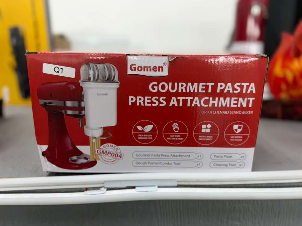 Eascandy Metal Gourmet Pasta Press Attachment for KitchenAid Stand Mixers, designed to extrude pasta dough into various shapes. (Q1)