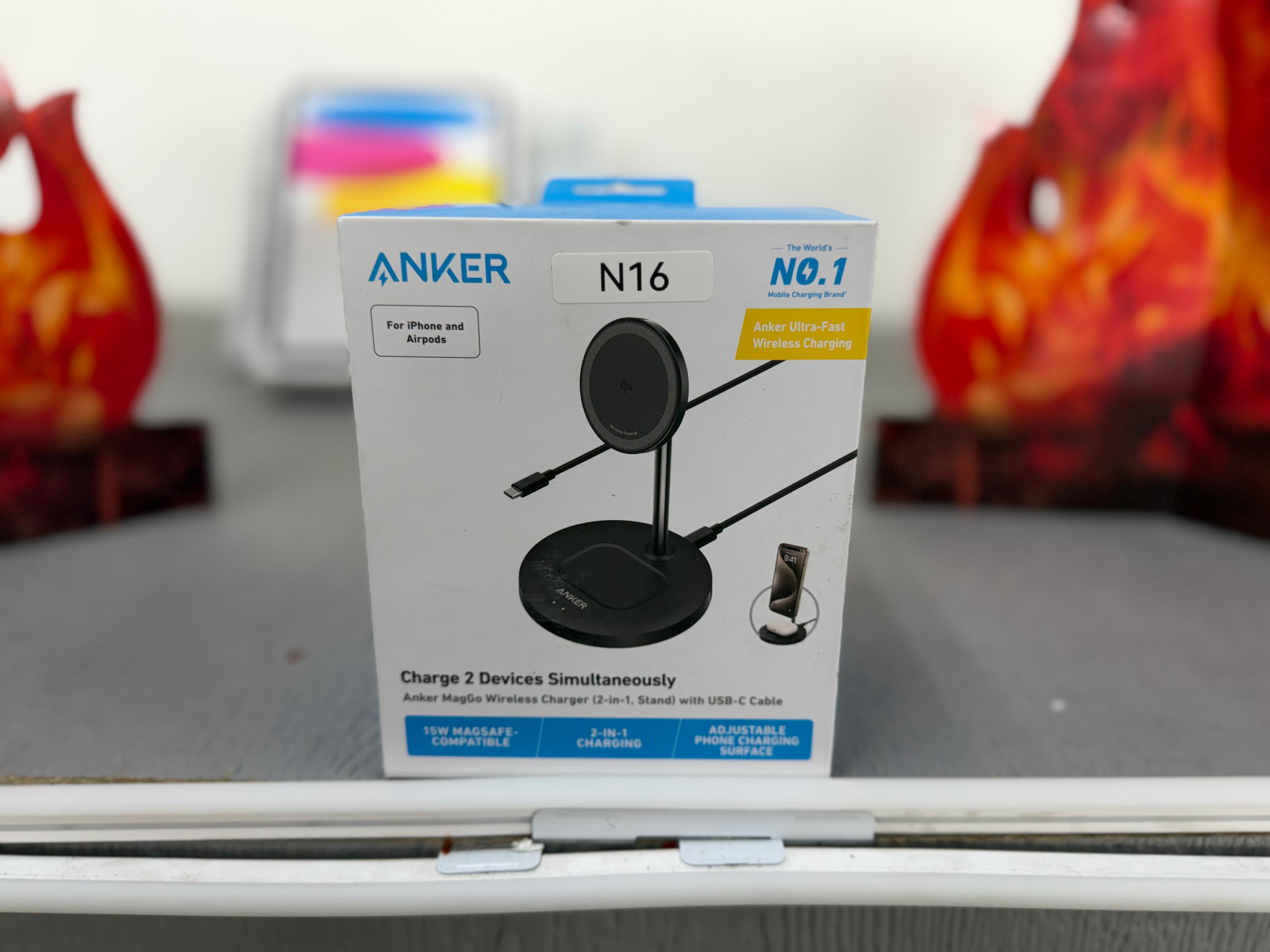 MagGo Wireless Charging Station (2-in-1 Stand), a magnetic charging stand compatible with MagSafe iPhones and AirPods.( N16)
