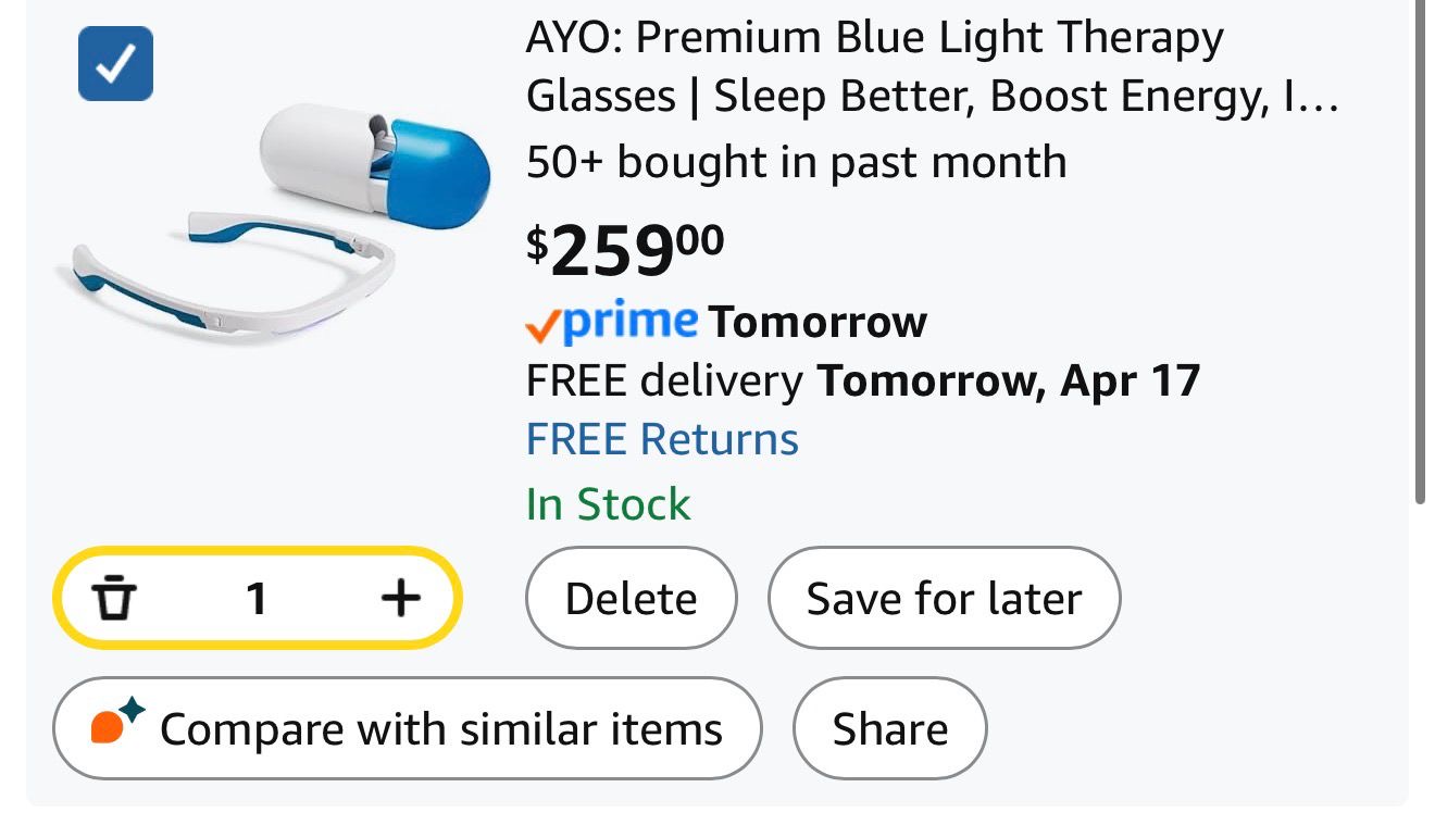 AYO Premium Blue Light Therapy Glasses are a wearable wellness device designed to help improve sleep quality, boost energy levels, and reduce jet lag by emitting specific wavelengths of light to align the body's circadian rhythm.( P18)