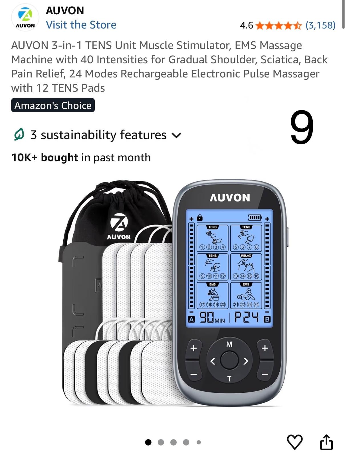 AUVON 3-in-1 TENS Unit Muscle Stimulator, EMS Massage Machine with 40 Intensities for Gradual Shoulder, Sciatica, Back Pain Relief, 24 Modes Rechargeable Electronic Pulse Massager with 12 TENS Pads. 9