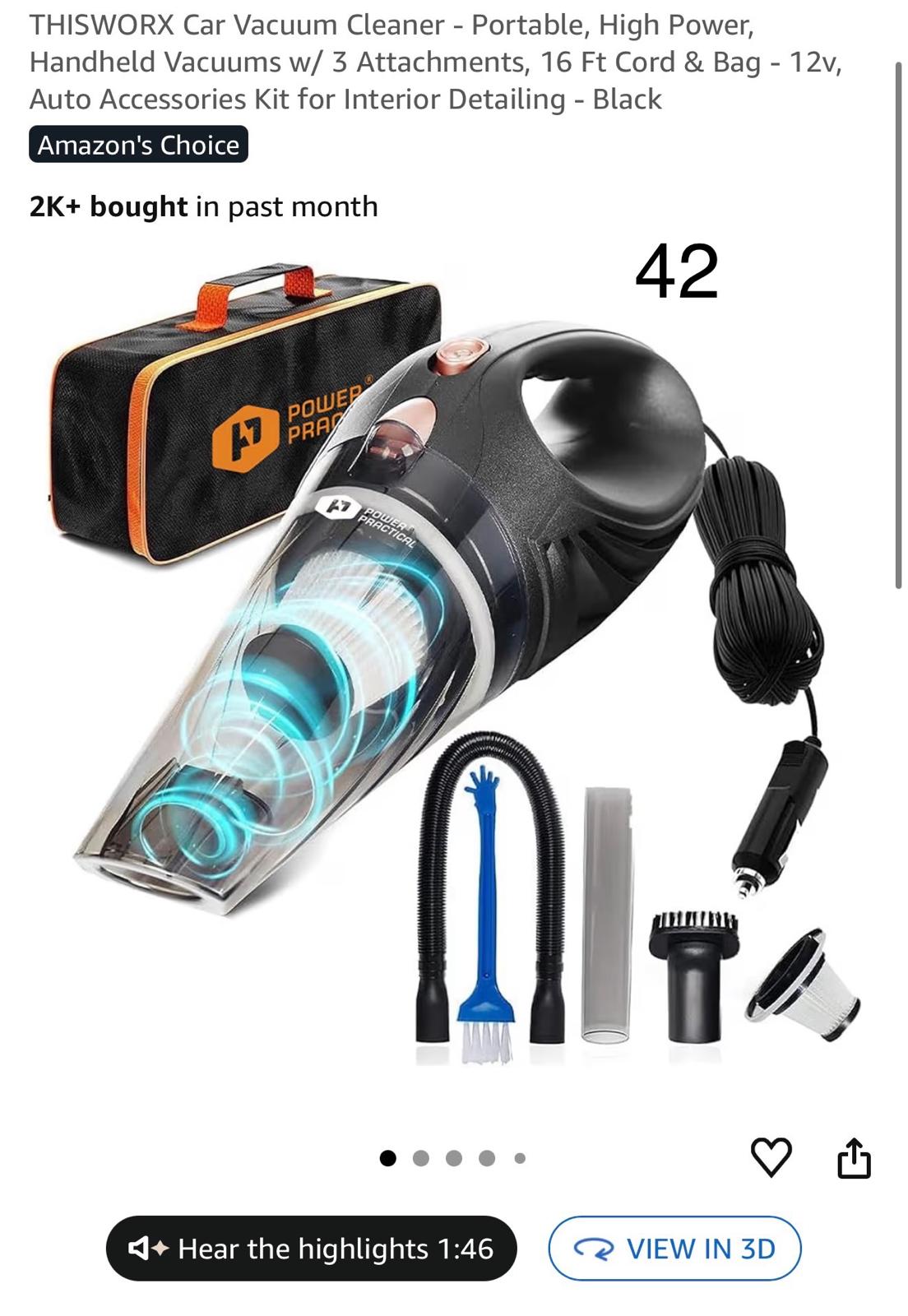 THISWORX Car Vacuum Cleaner - Portable, High Power, Handheld Vacuums w/ 3 Attachments, 16 Ft Cord & Bag - 12v, Auto Accessories Kit for Interior Detailing - Black. 42