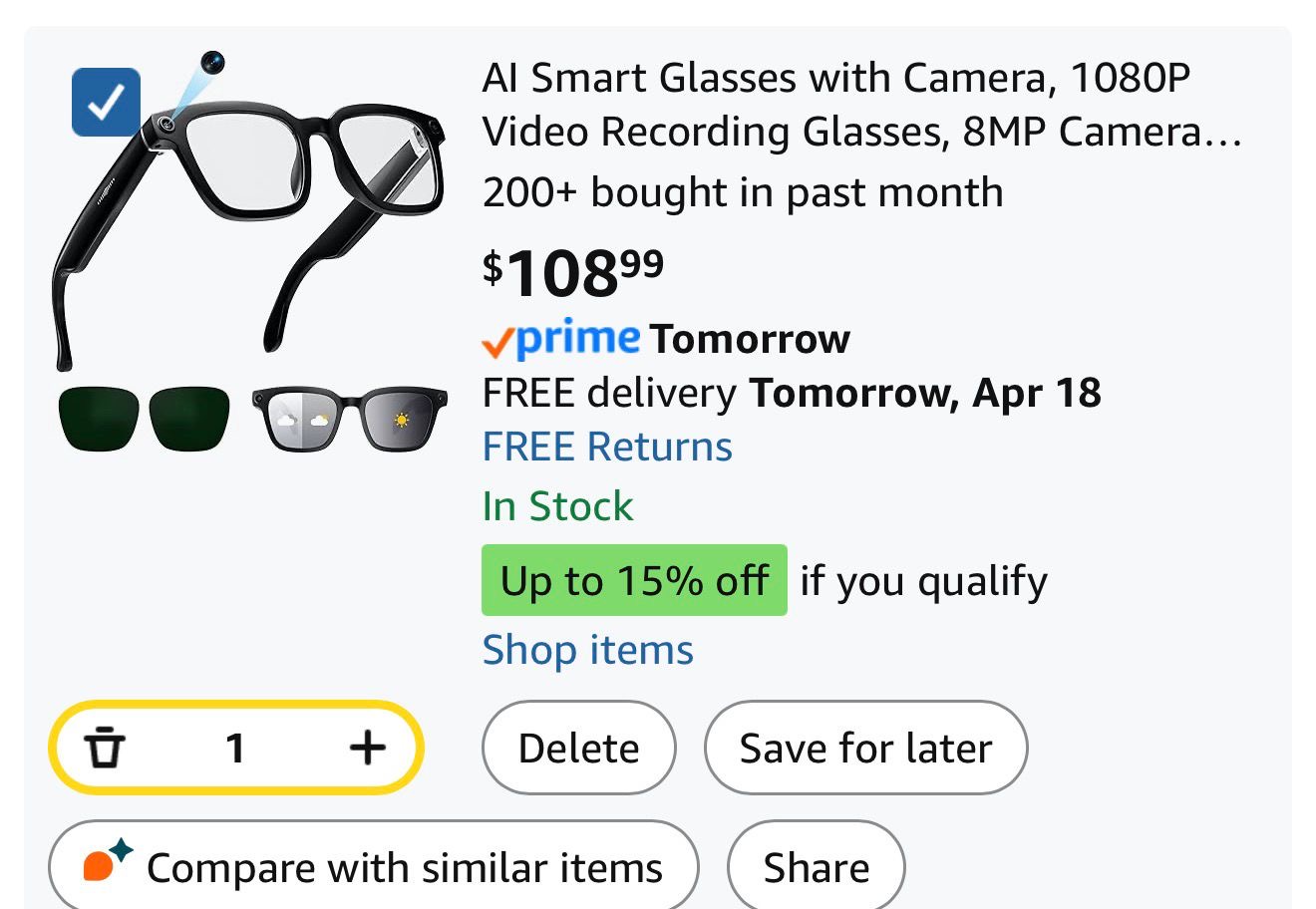 Amwentu AI Smart Glasses which feature a 1080P video recording camera and a voice assistant. (T5)