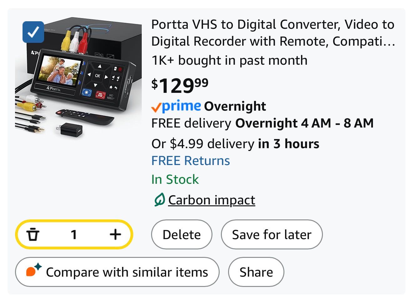 Portta VHS to Digital Converter, a device used to record analog video signals directly onto a USB drive or SD card. (T4)