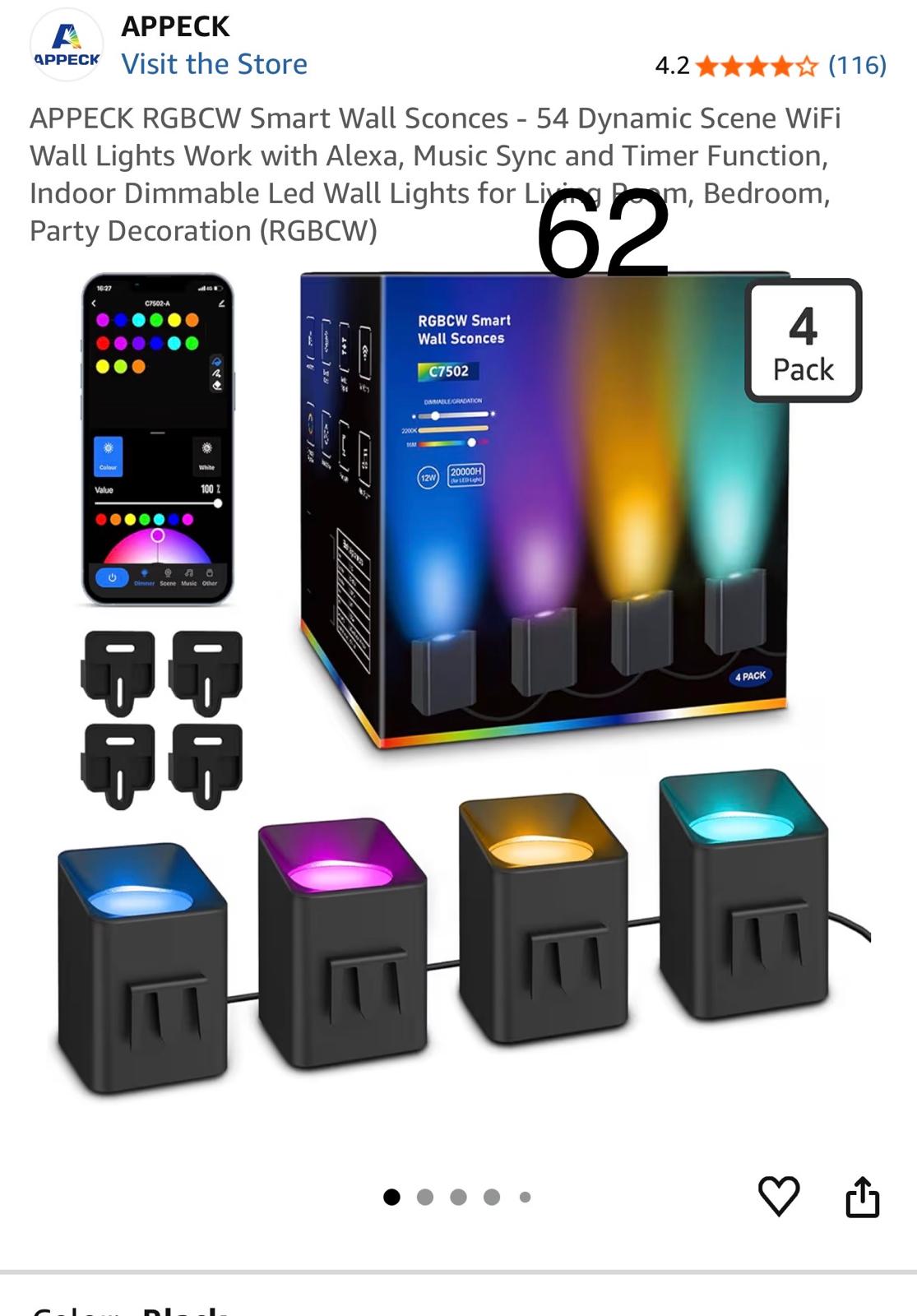 APPECK RGBCW Smart Wall Sconces - 54 Dynamic Scene WiFi Wall Lights Work with Alexa, Music Sync and Timer Function, Indoor Dimmable Led Wall Lights for Living Room, , Bedroom, Party Decoration (RGBCW). 62