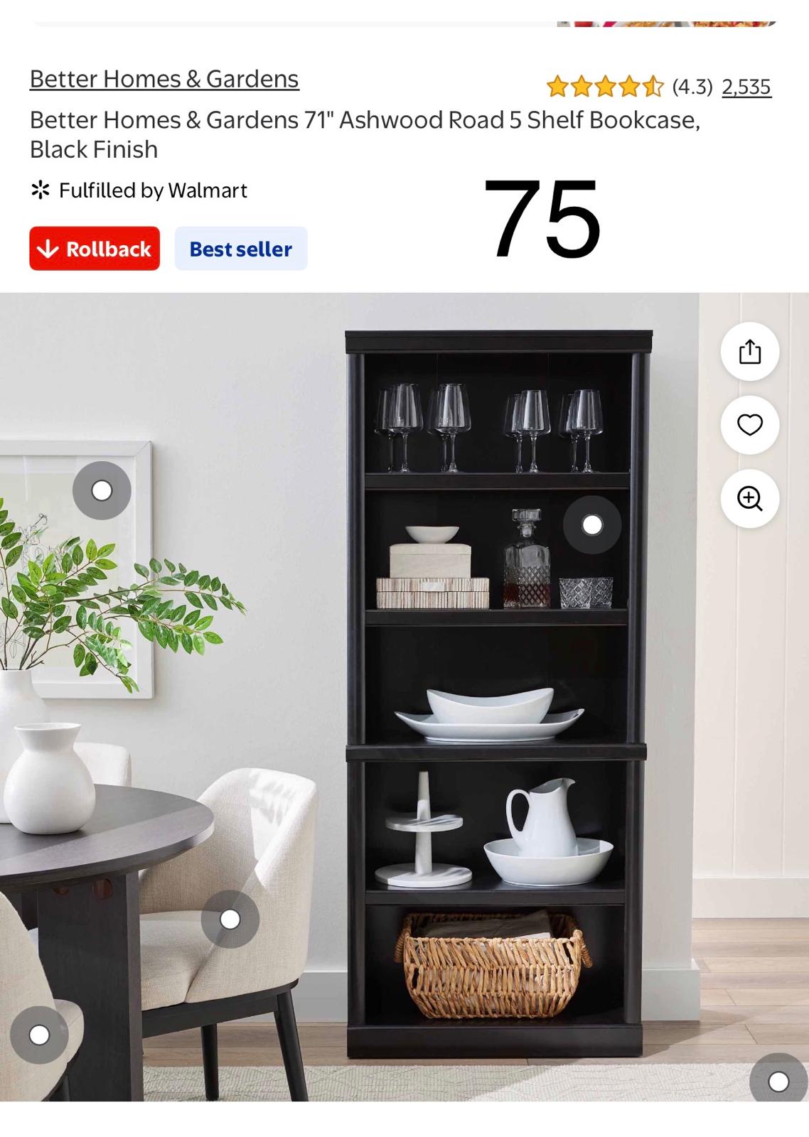 Better Homes & Gardens 71" Ashwood Road 5 Shelf Bookcase, Black Finish. 75