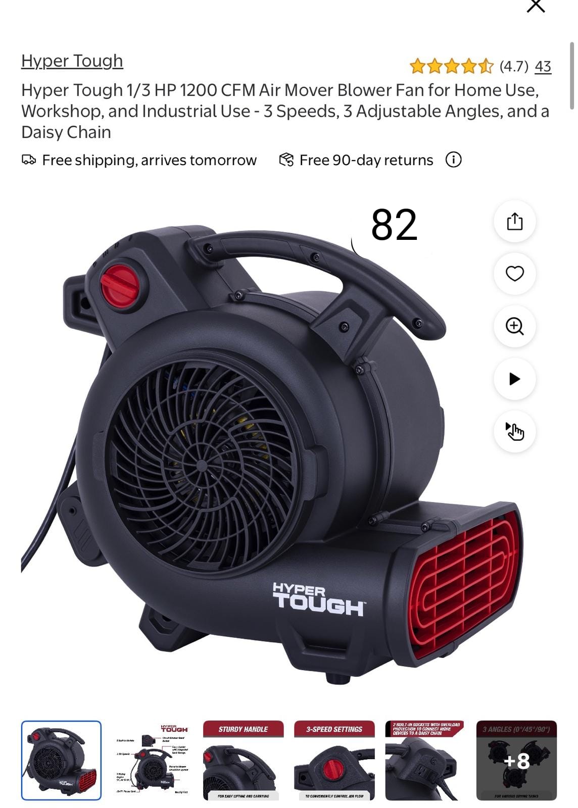Hyper Tough 1/3 HP 1200 CFM Air Mover Blower Fan for Home Use, Workshop, and Industrial Use - 3 Speeds, 3 Adjustable Angles, and a Daisy Chain. 82