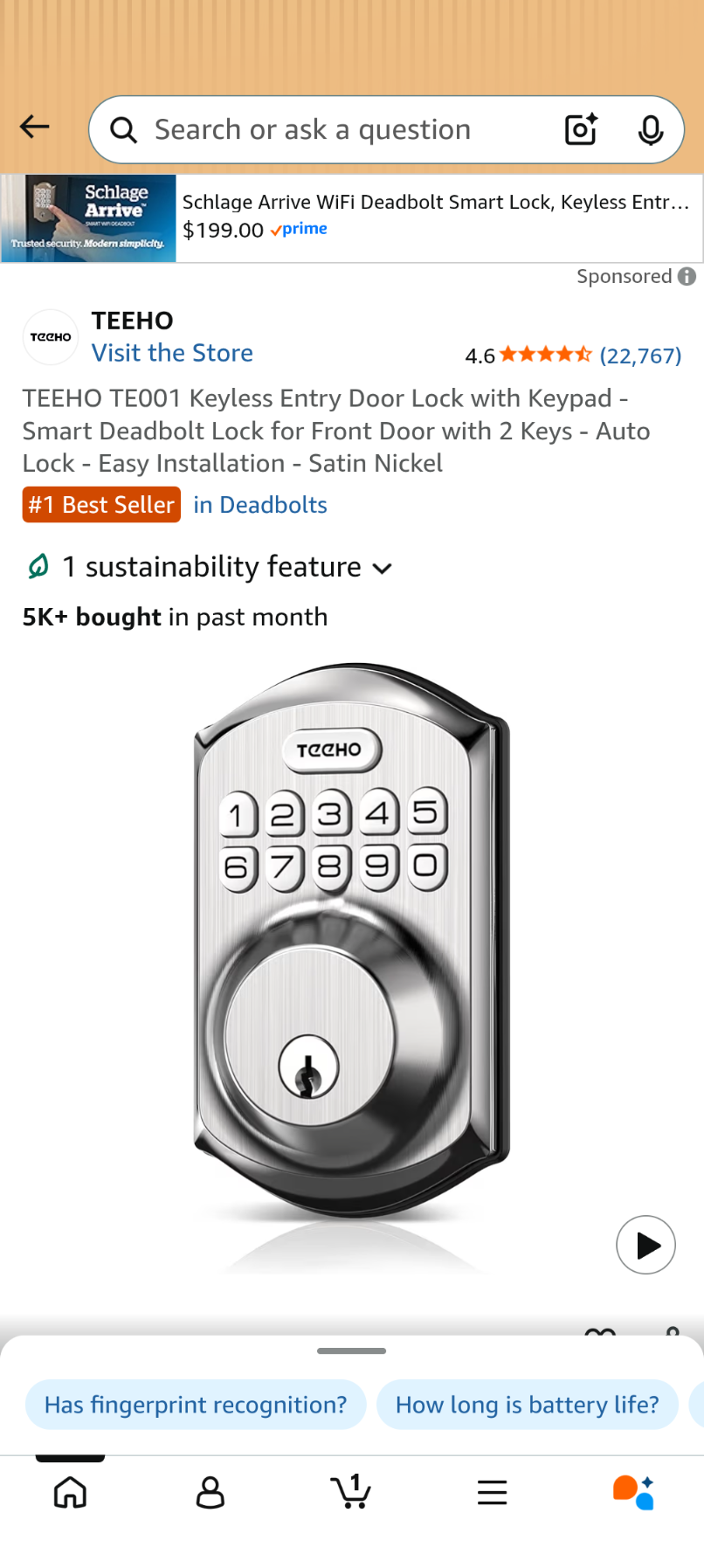 A014 TEEHO TE001 Keyless Entry Door Lock with Keypad - Smart Deadbolt Lock for Front Door with 2 Keys - Auto Lock - Easy Installation - Satin Nickel