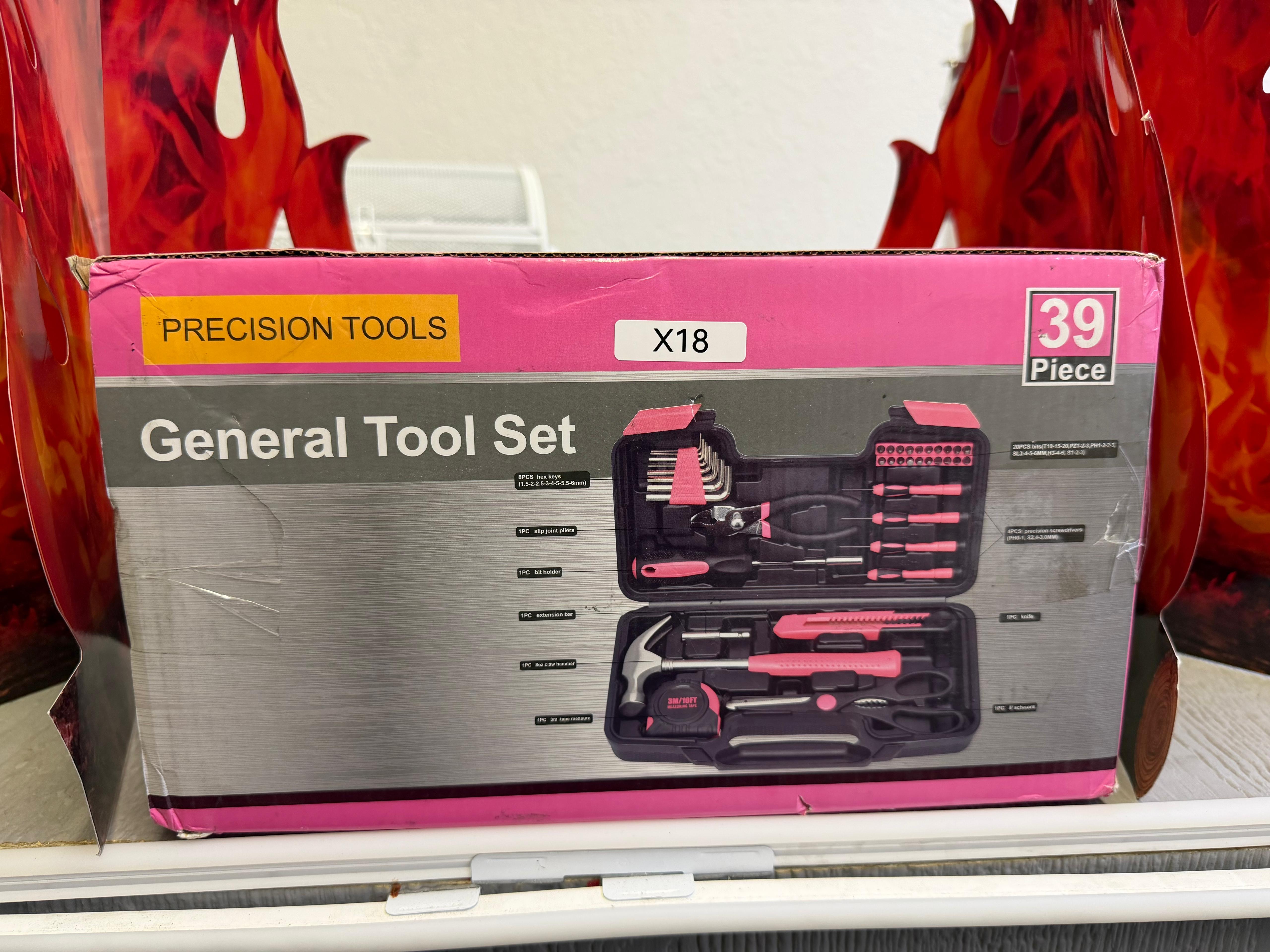 39-Piece All Purpose Basic Household Pink Tool Kit, featuring a compact toolbox for organized storage. (X18)