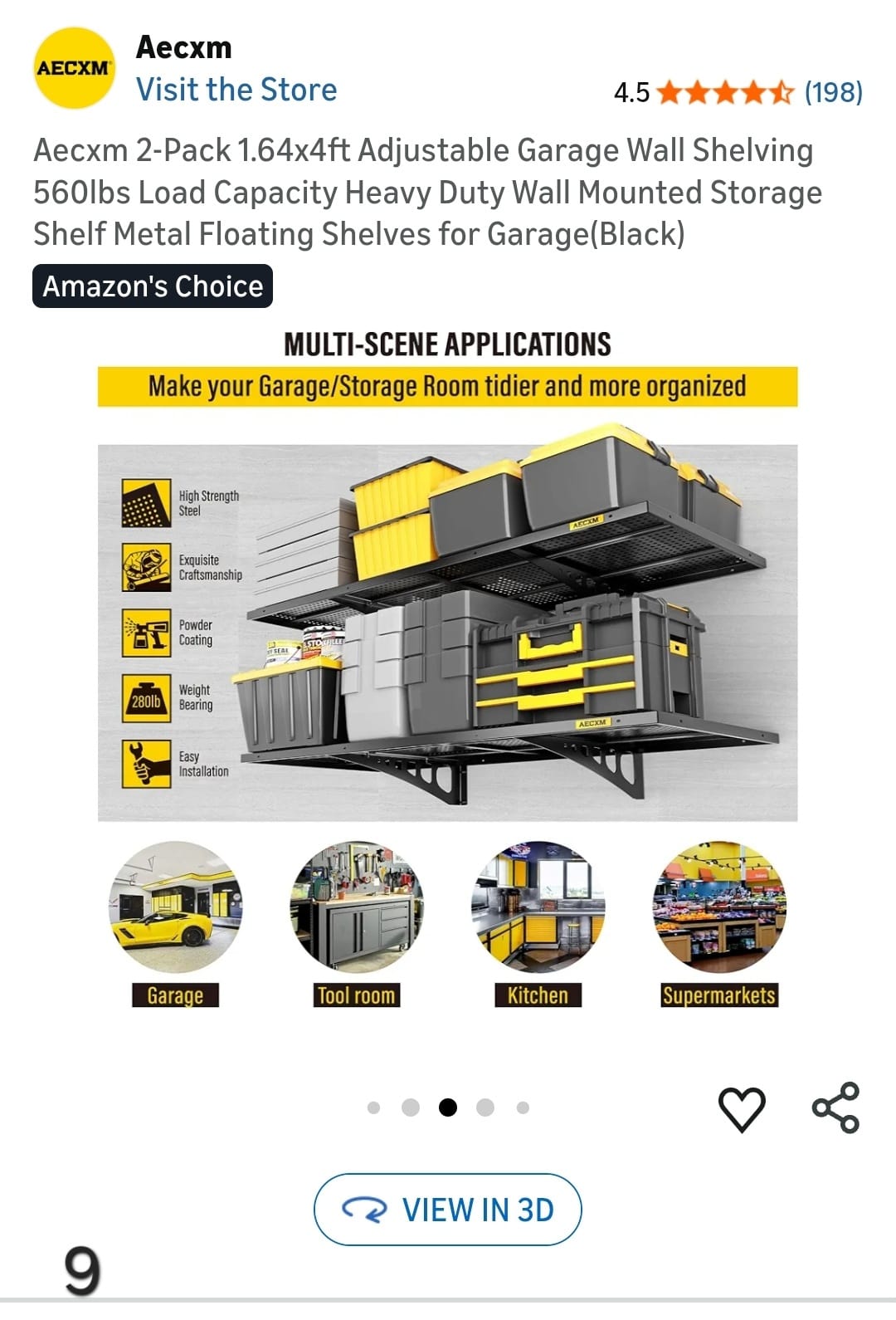 Aecxm 2-Pack 1.64x4ft Adjustable Garage Wall Shelving 560lbs Load Capacity Heavy Duty Wall Mounted Storage Shelf Metal Floating Shelves for Garage(Black). Lv9