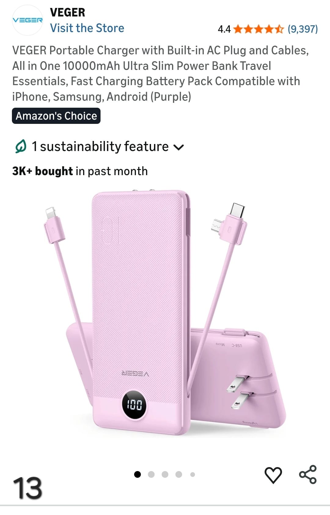 VEGER Portable Charger with Built-in AC Plug and Cables, All in One 10000mAh Ultra Slim Power Bank Travel Essentials, Fast Charging Battery Pack Compatible with iPhone, Samsung, Android. Lv13