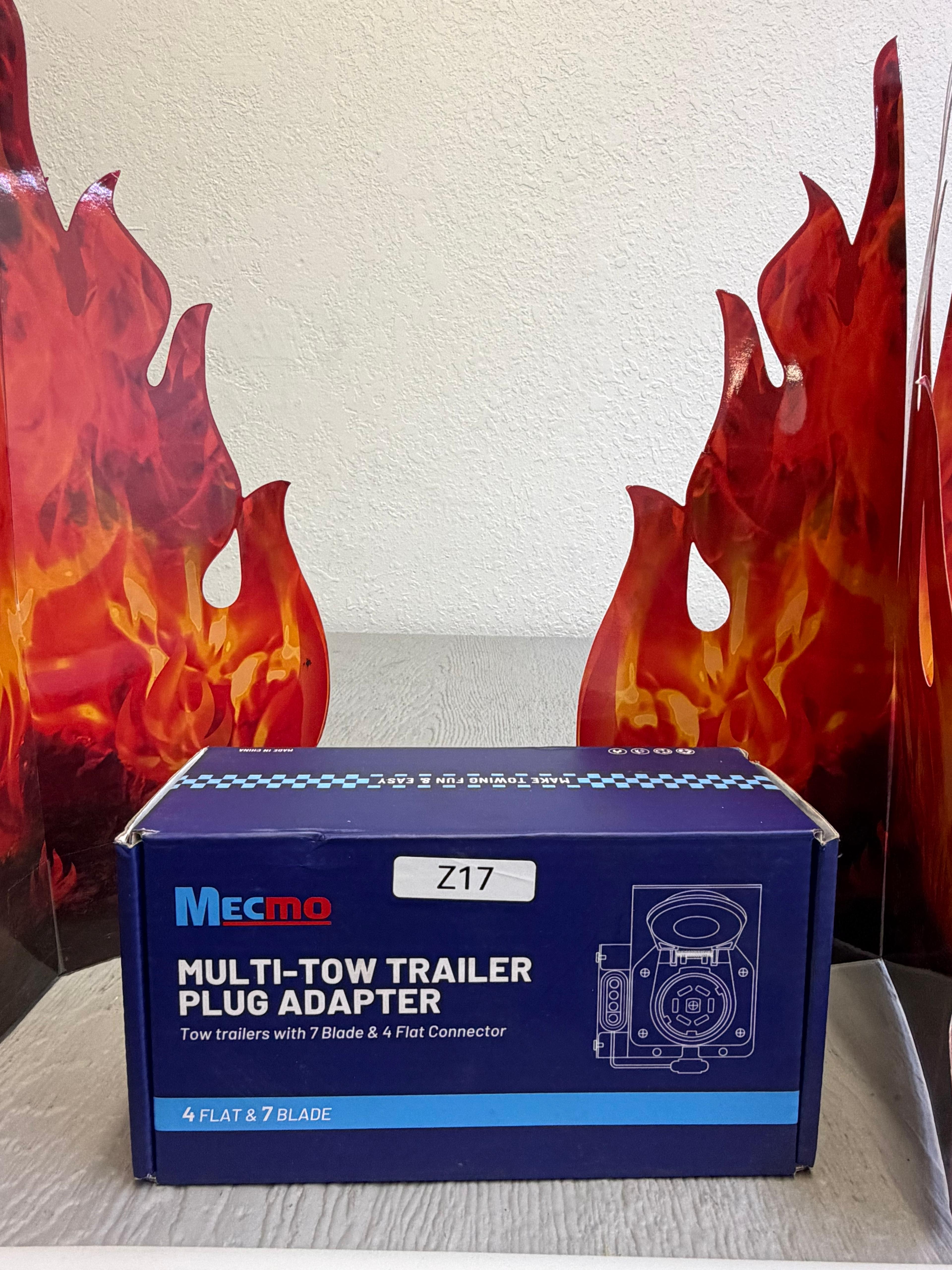MECMO Multi-Tow trailer wiring adapter connector kit, which allows a 4-pin flat vehicle-side connector to be converted to a dual-output 7-way RV blade and 4-way flat connector. (Z17)