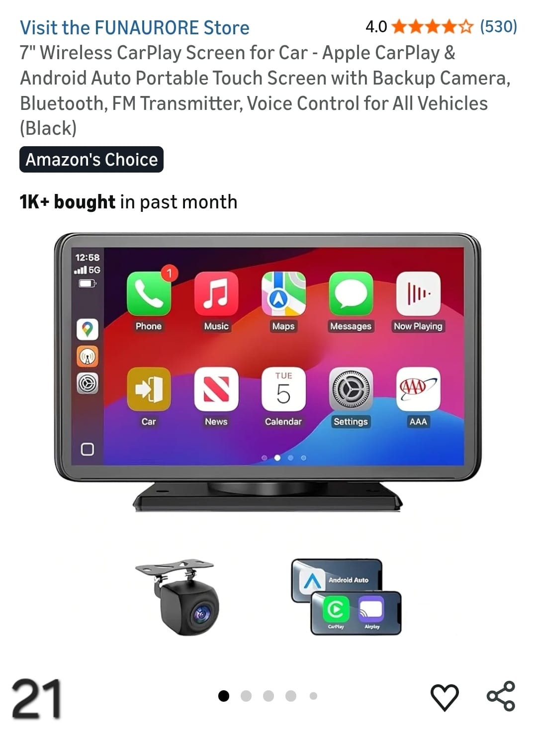 7" Wireless CarPlay Screen for Car - Apple CarPlay & Android Auto Portable Touch Screen with Backup Camera, Bluetooth, FM Transmitter, Voice Control for All Vehicles. Lv21