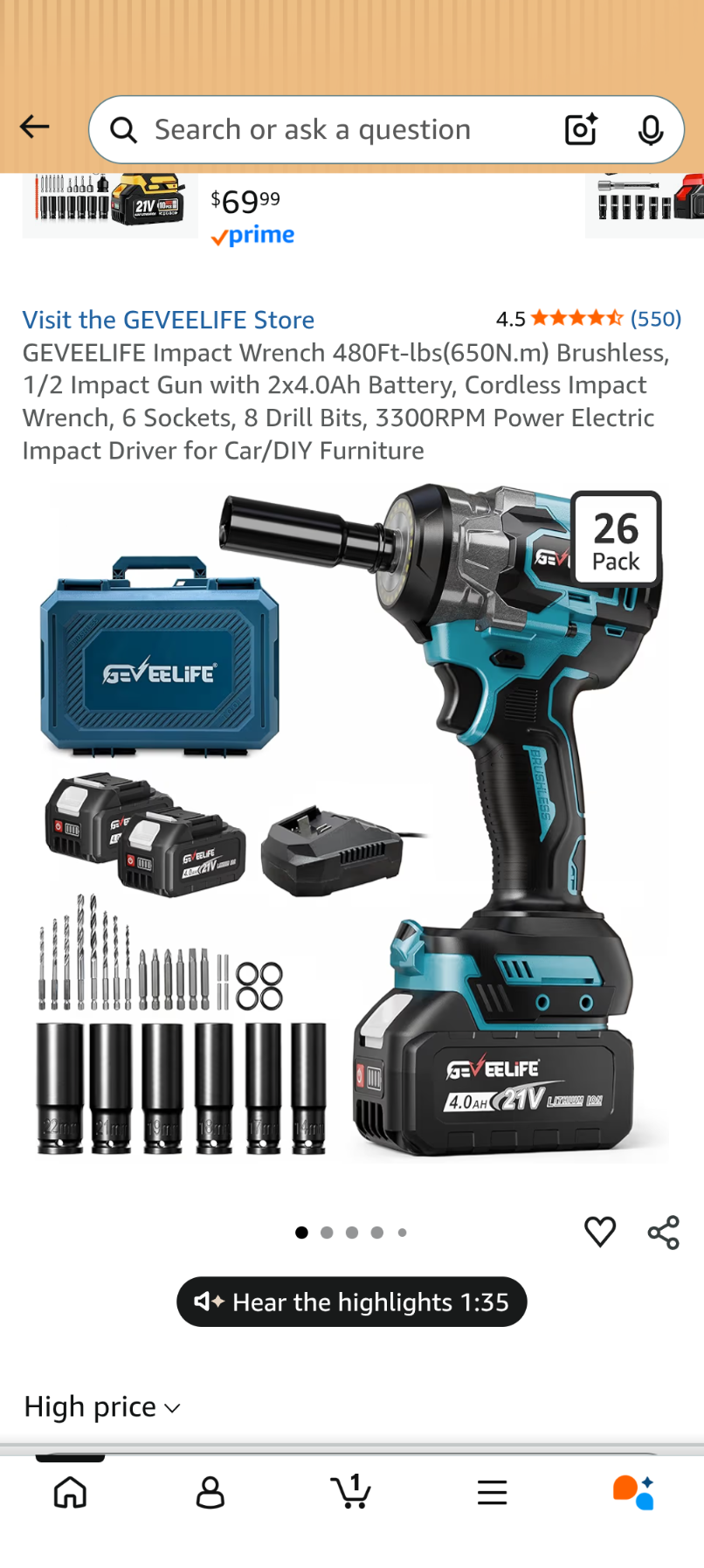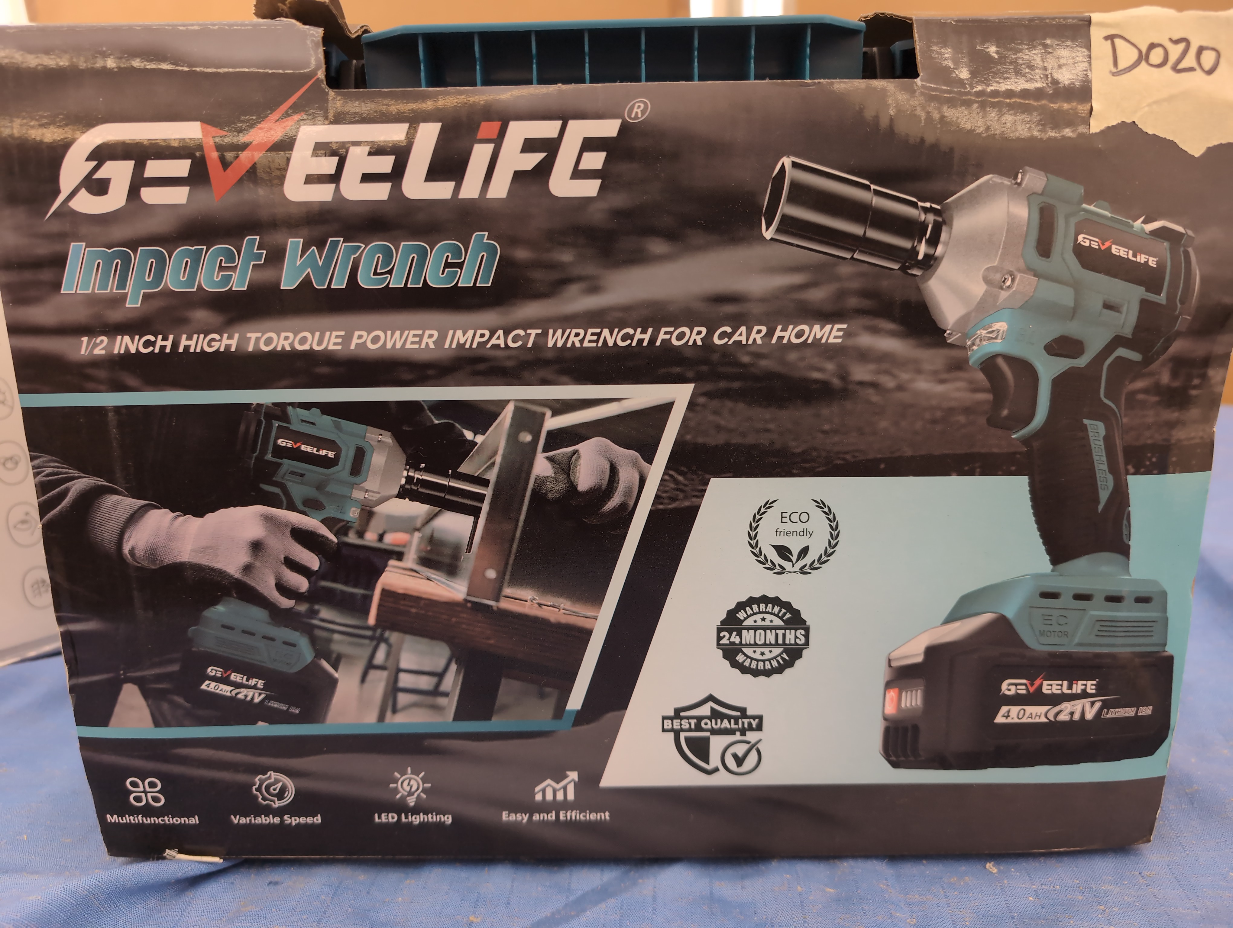 D020 GEVEELIFE Impact Wrench 480Ft-lbs(650N.m) Brushless, 1/2 Impact Gun with 2x4.0Ah Battery, Cordless Impact Wrench, 6 Sockets, 8 Drill Bits, 3300RPM Power Electric Impact Driver for Car/DIY Furniture