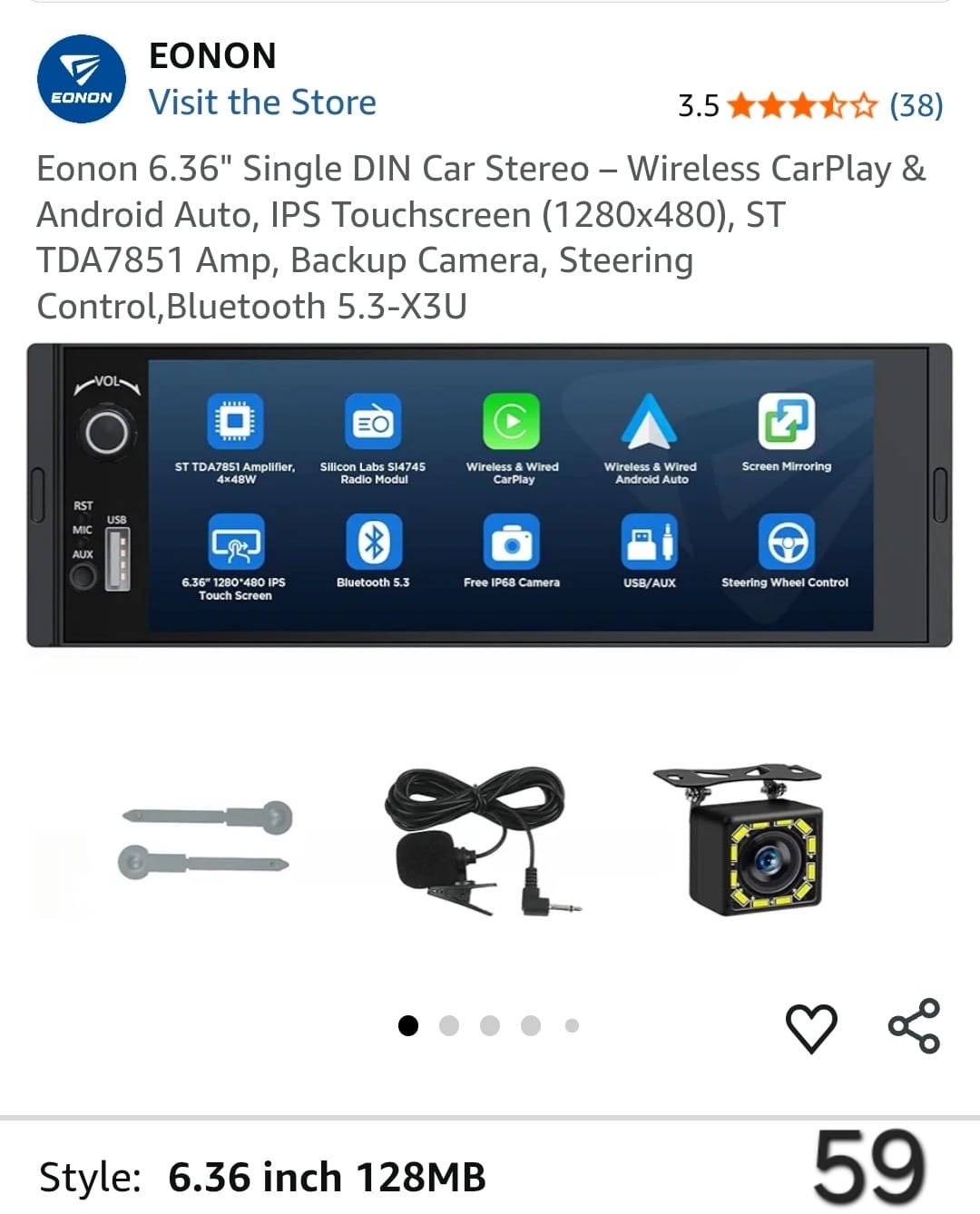 Eonon 6.36" Single DIN Car Stereo - Wireless CarPlay & Android Auto, IPS Touchscreen (1280x480), ST TDA7851 Amp, Backup Camera, Steering Control, Bluetooth 5.3-X3U. Lv59
