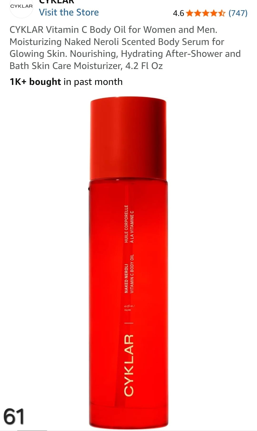 CYKLAR Vitamin C Body Oil for Women and Men. Moisturizing Naked Neroli Scented Body Serum for Glowing Skin. Nourishing, Hydrating After-Shower and Bath Skin Care Moisturizer, 4.2 Fl Oz. Lv61