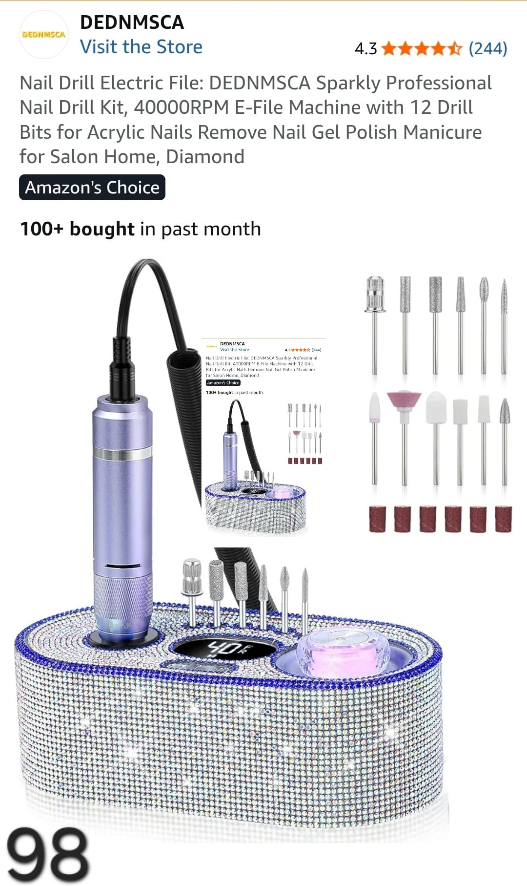 Nail Drill Electric File: DEDNMSCA Sparkly Professional Nail Drill Kit, 40000RPM E-File Machine with 12 Drill Bits for Acrylic Nails Remove Nail Gel Polish Manicure for Salon Home, Diamond. Lv98