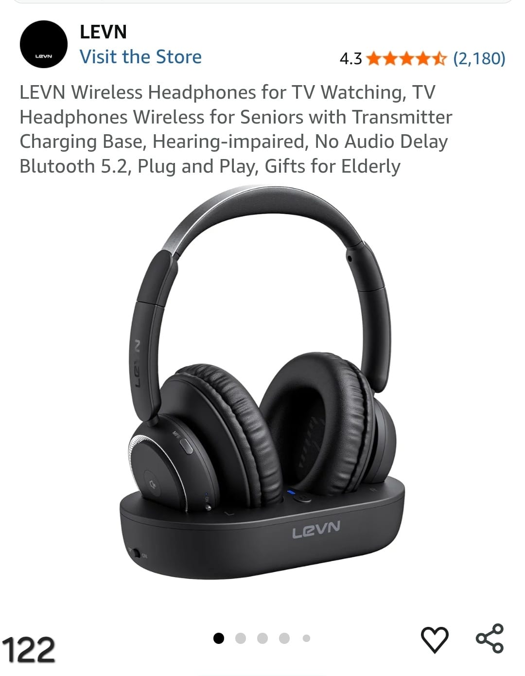LEVN Wireless Headphones for TV Watching, TV Headphones Wireless for Seniors with Transmitter Charging Base, Hearing-impaired, No Audio Delay Blutooth 5.2, Plug and Play, Gifts for Elderly. Lv122