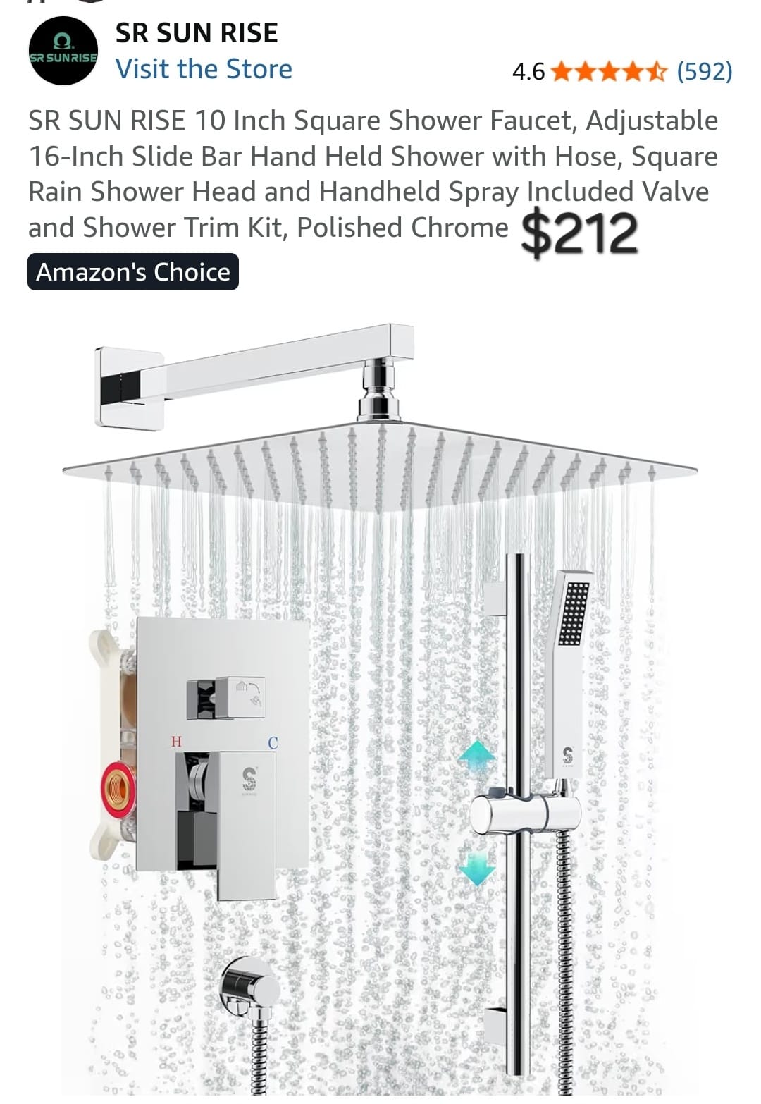 SR SUN RISE 10 Inch Square Shower Faucet, Adjustable 16-Inch Slide Bar Hand Held Shower with Hose, Square Rain Shower Head and Handheld Spray Included Valve and Shower Trim Kit, Polished Chrome. Lv135