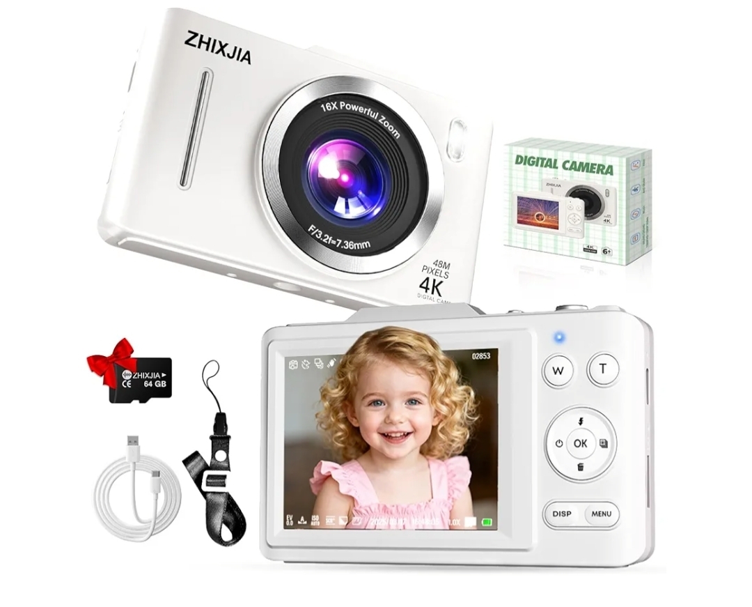 Ending On: 22/02/2026 07:21 Preview Time: 06:45 PMDigital Camera, Full HD 4K Digita Point and Shoot Camera Portable Compact and for 16X Zoom, Autofocus for Photography with 64GB Card, Anti-Shake, for Beginners, Boys Girls Kids, White
