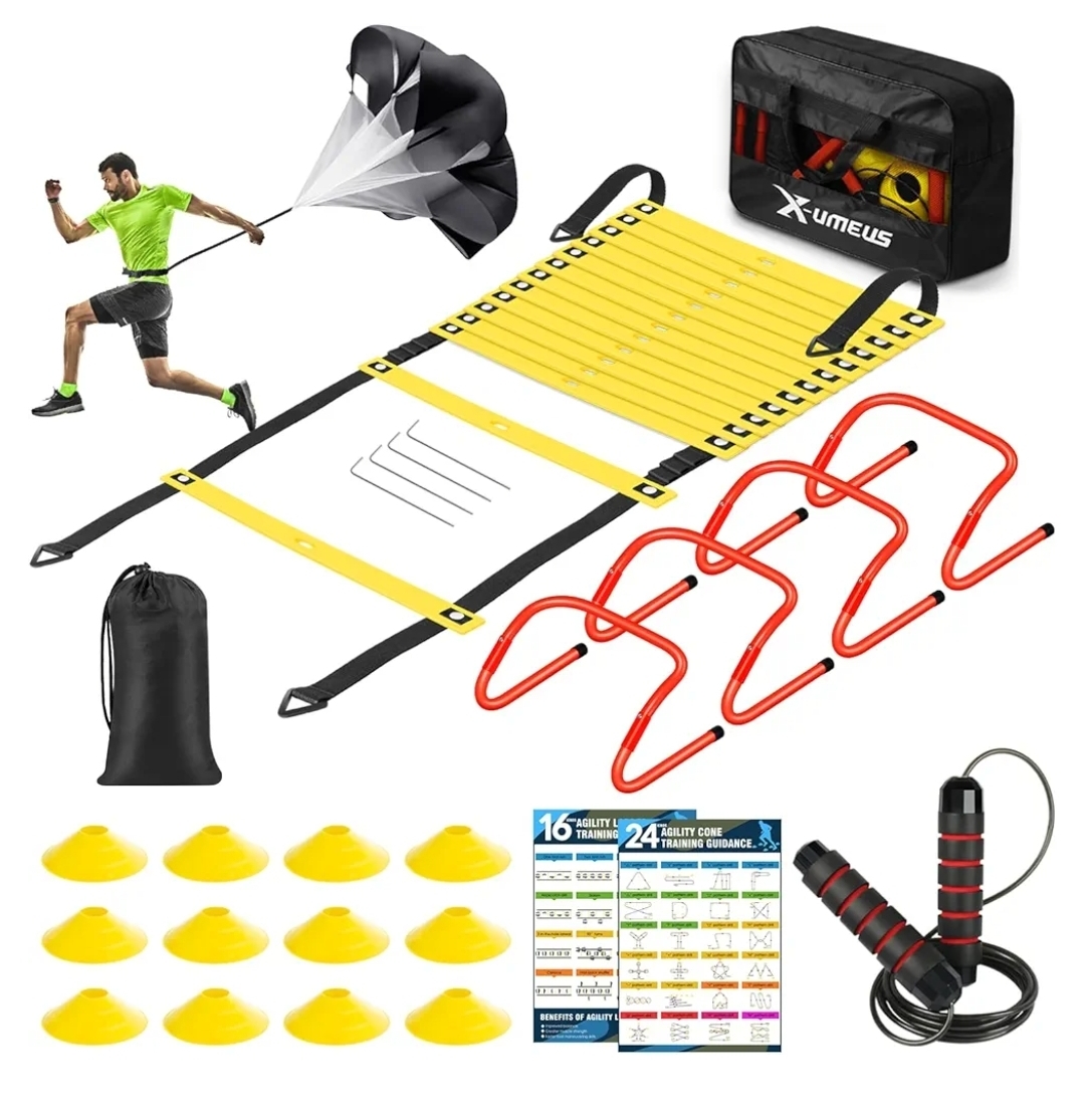 Ending On: 22/02/2026 07:21 Preview Time: 07:48 PMAgility Ladder Speed Training Equipment Set-20ft Agility Ladder,12 Soccer Cones,4 Hurdles, Jump Rope, Running Parachute| Basketball Football Soccer Training Equipment for Kids Youth Adults